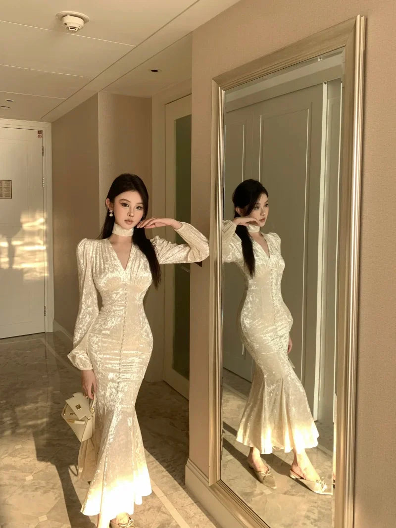 maoxiangshop Elegant Chic Single Breasted Velvet Midi Dresses for Women Spring Autumn Vintage Evening Party Slim Mermaid Female Clothing Robe