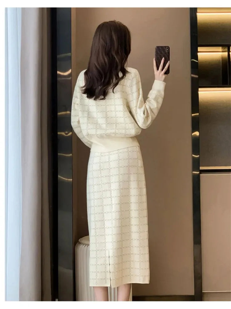 Elegant Half Turtleneck Plaid Sweaters Tops+slim High Waist Knitwear Skirts 2 Piece Sets Women New Streetwear Pullover Tracksuit