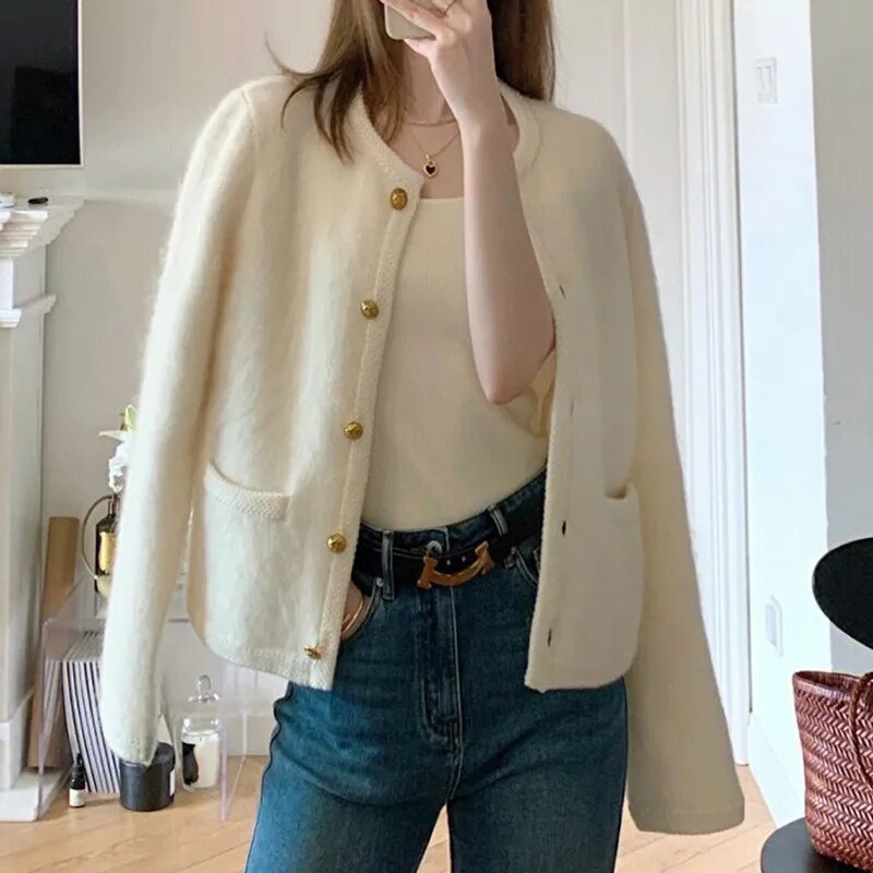 maoxiangshop Elegant Knitted White Jacket Women Round Neck Autumn Winter Fuzzy Cardigan Woman New Long Sleeve Sweater Jacket