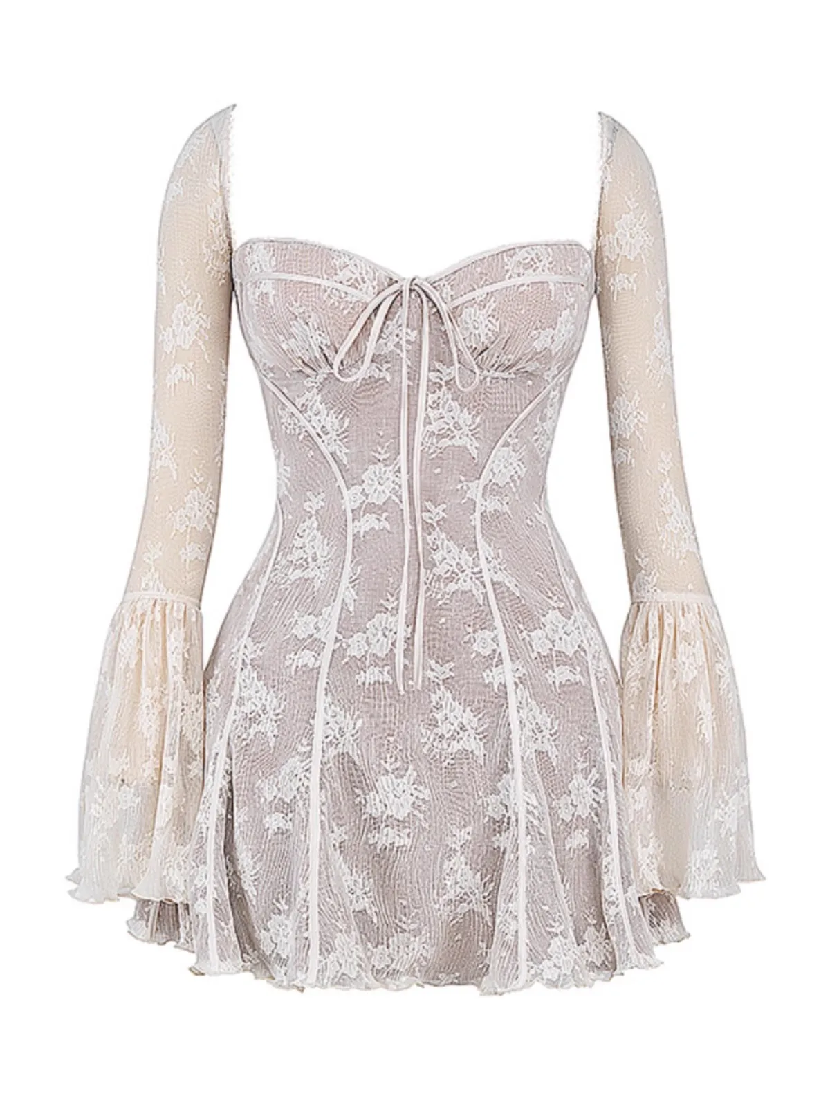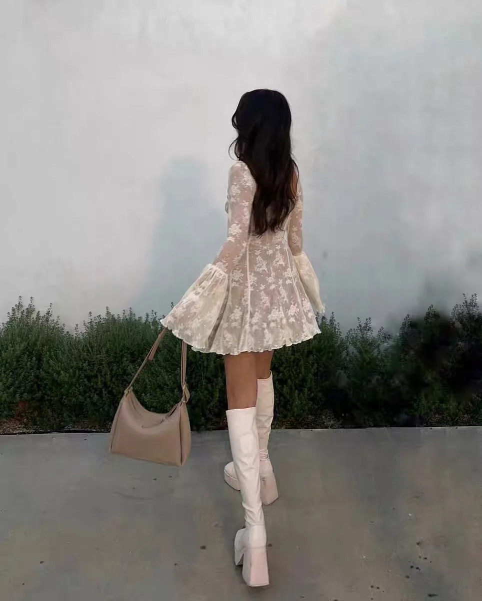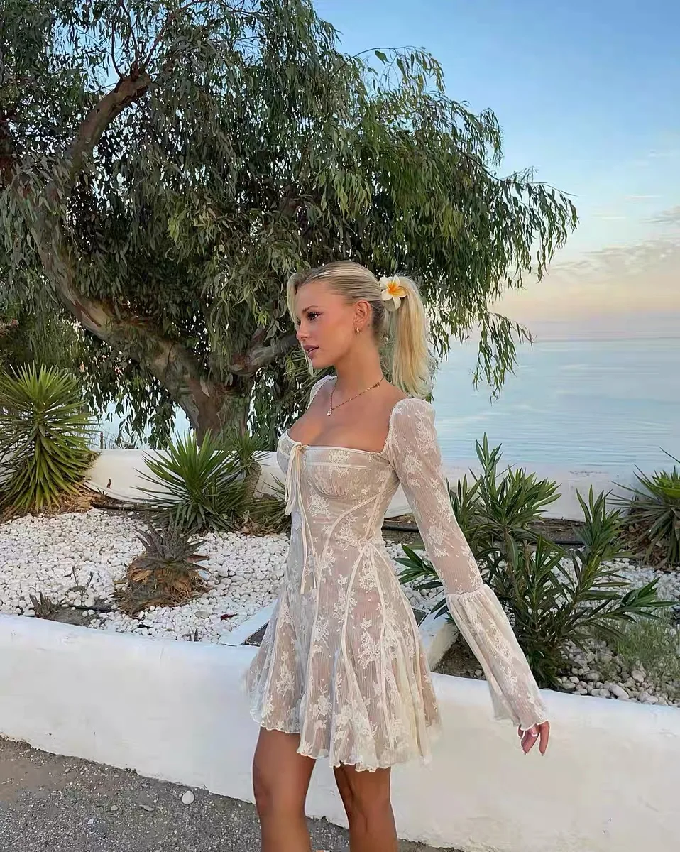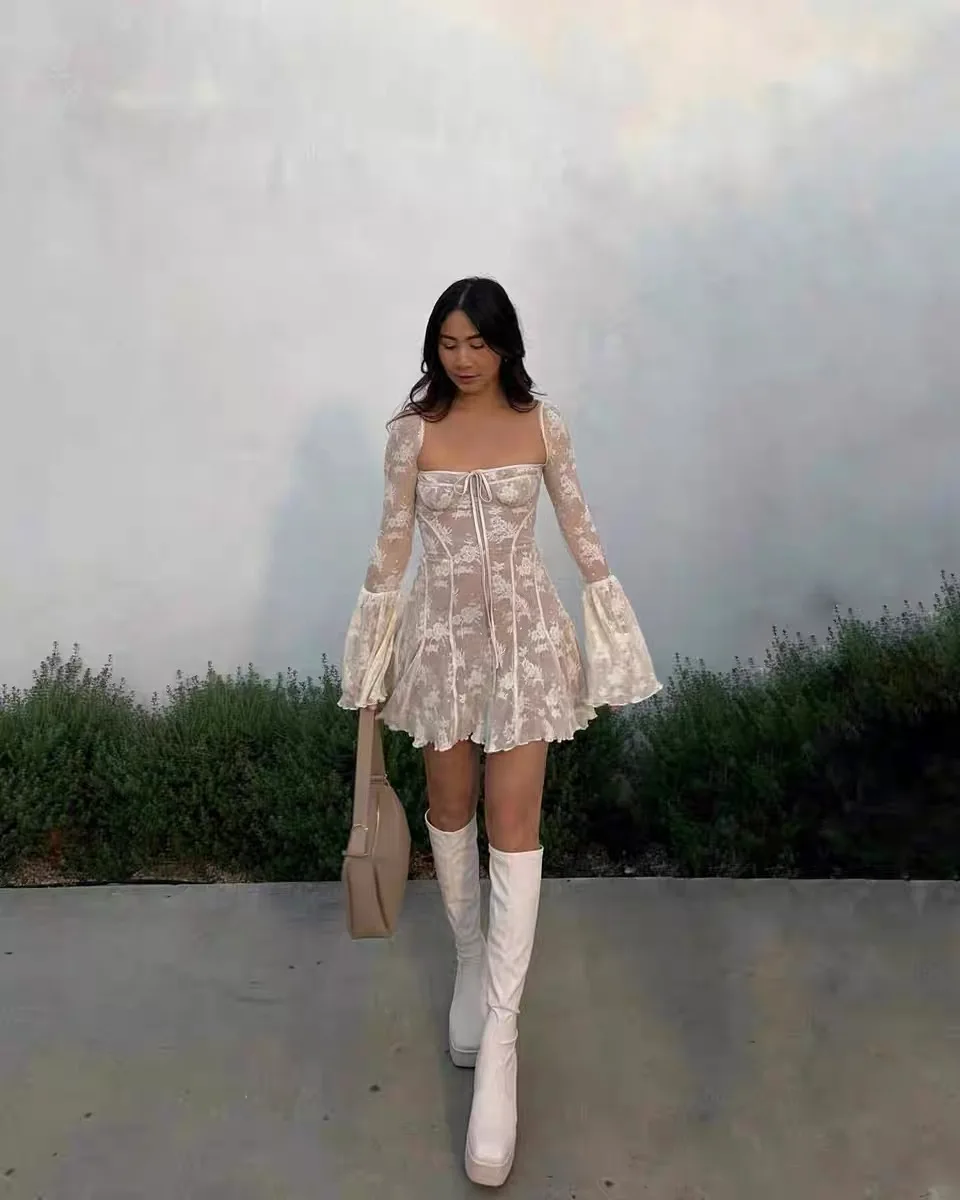 Elegant Lace Mini Dress Women Flare Sleeve Square Collar Autumn Winter New Evening Party Prom Dresses Sexy Y2K Chic Streetwear
