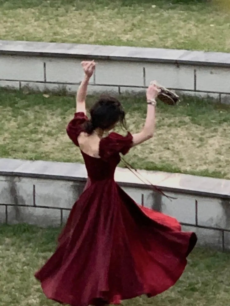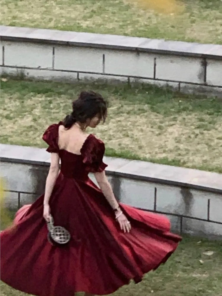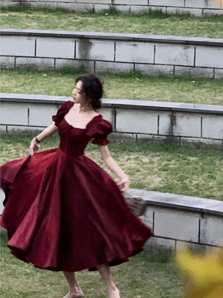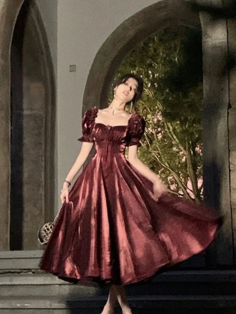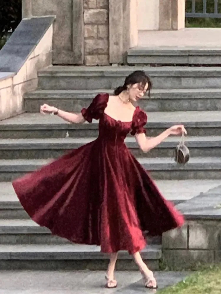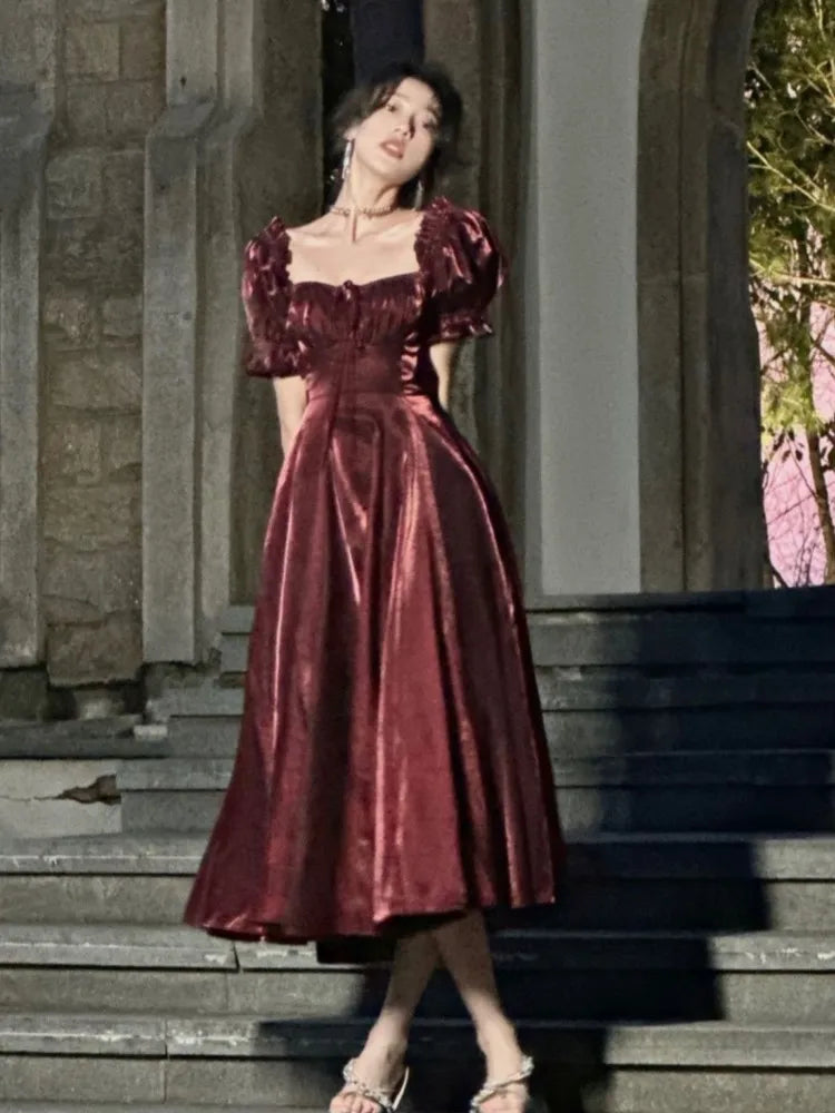 Elegant Princess Long Dress Women Puff Sleeve Square Collar High Waist Evening Party A-line Solid Lace-up Vestidos Robe Mujers