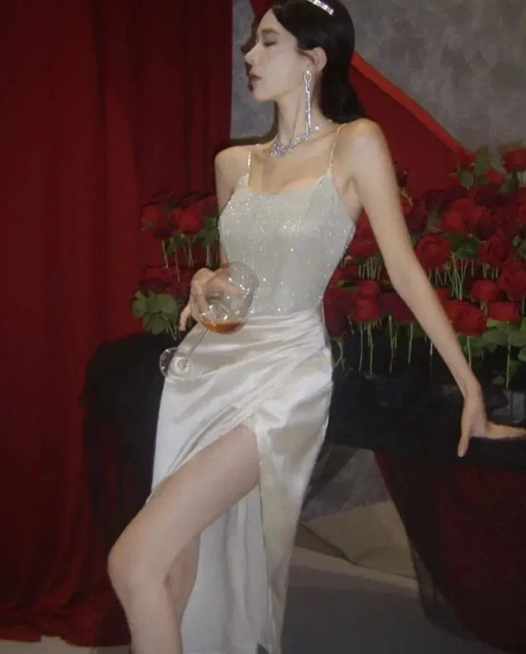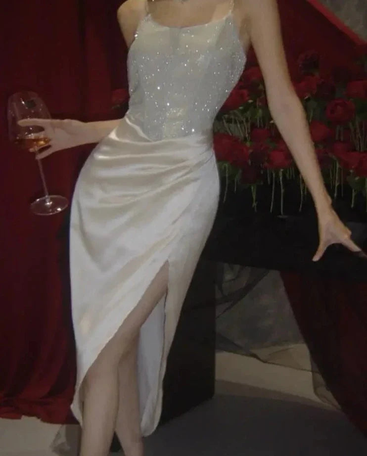 Elegant Shiny Satin Wedding Evening Dress For Women Summer Spaghetti Strap Luxurious Split Runway Vestidos Graduation Dresses