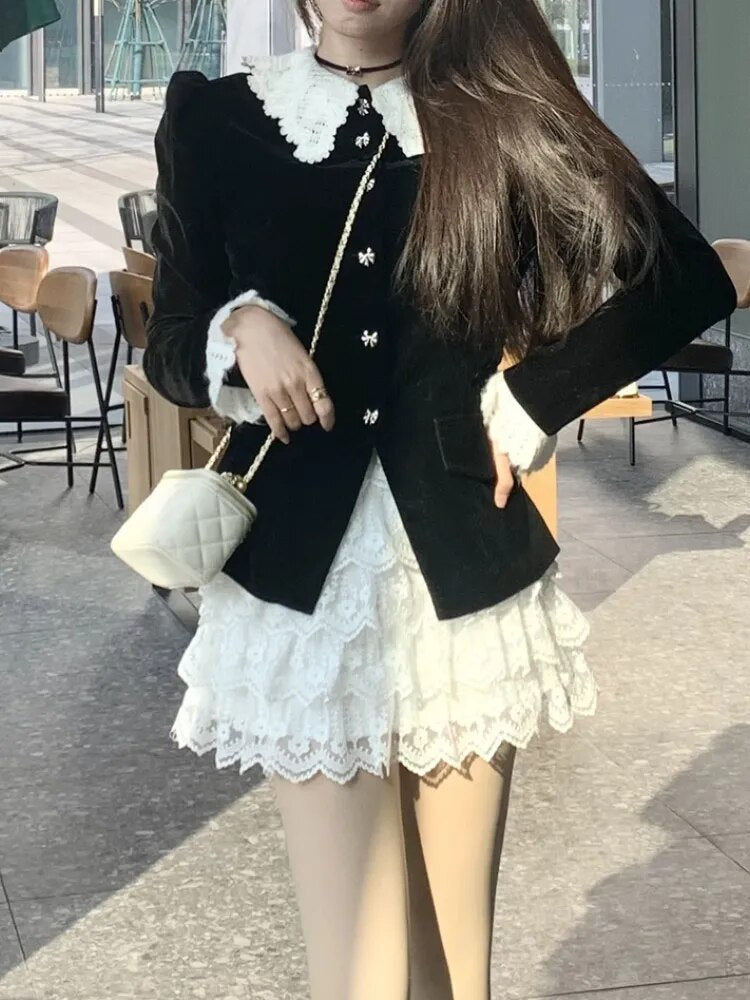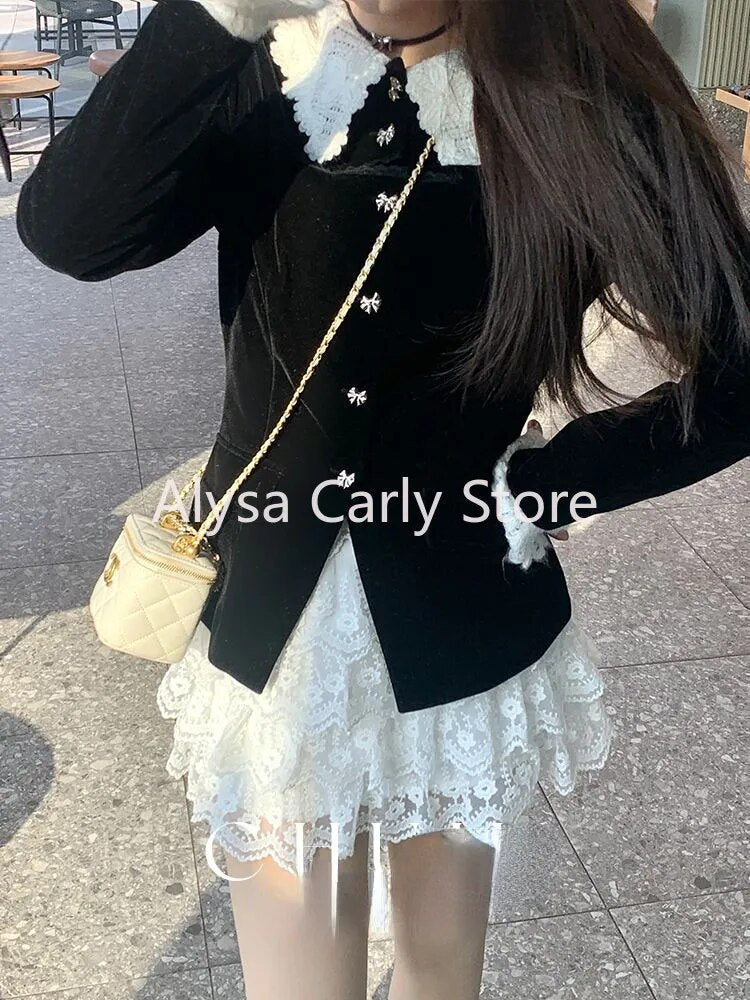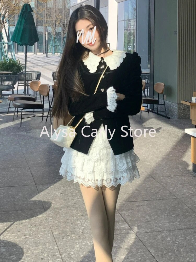Elegant Velvet 2 Piece Dress Set Women 2023 Winter Vintage Party Korean Style Suits Long Sleeve Velvet Tops + Casual Lace Skirt