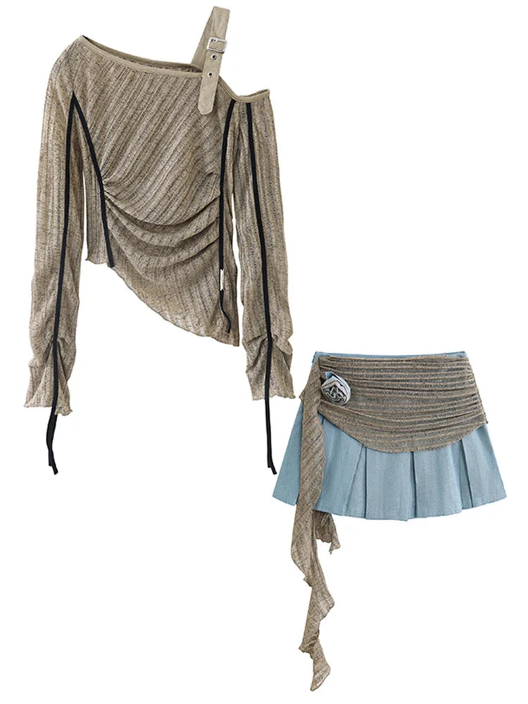 Fall Women Vintage Gyaru Rave Outfits 2 Piece Set Long Sleeve Off Shoulder Y2k Crop Tops + Vintage A-line Mini Pleated Skirts