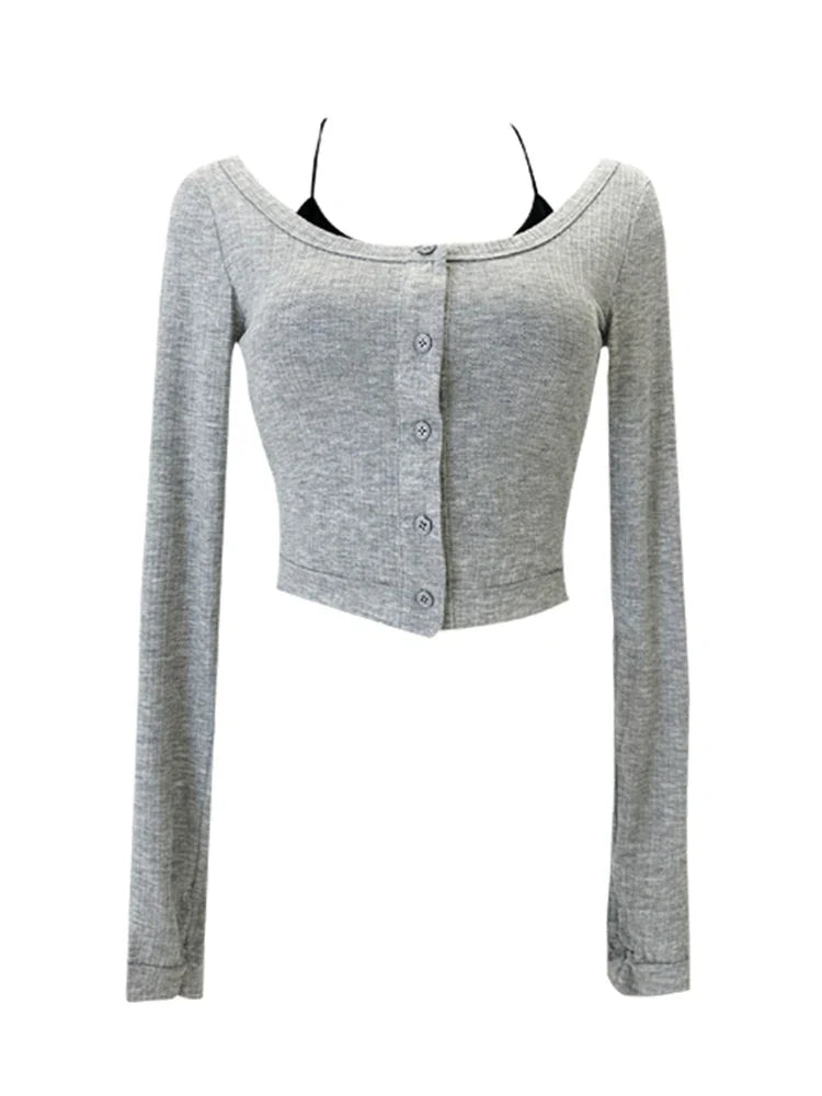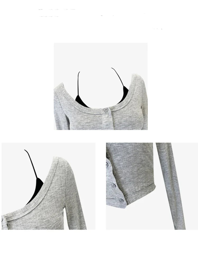 Fall Women Vintage Long Sleeve Gyaru Two Pieces Set Korean Fashion Crop Tops Design Bodycon T-Shirts Y2k Streetwear 2000s Tide