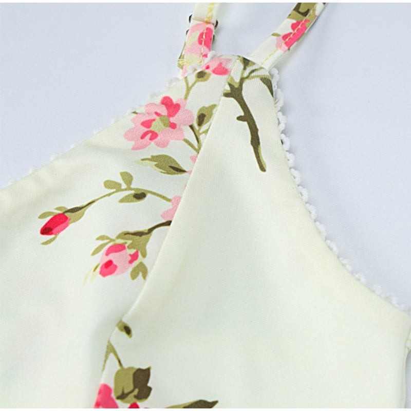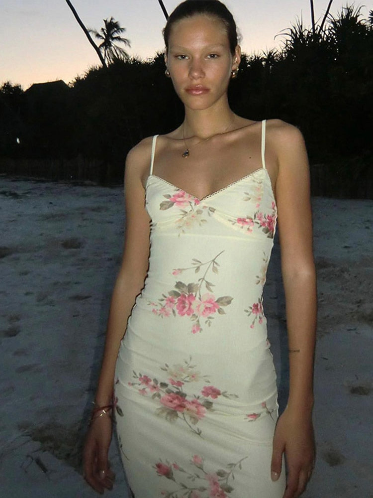 Fashion Flower Print Spaghetti Strap Dress Women Elegant V Neck Backless Midi Dresses Summer New Sweet Ladies Vestidos