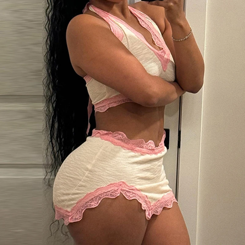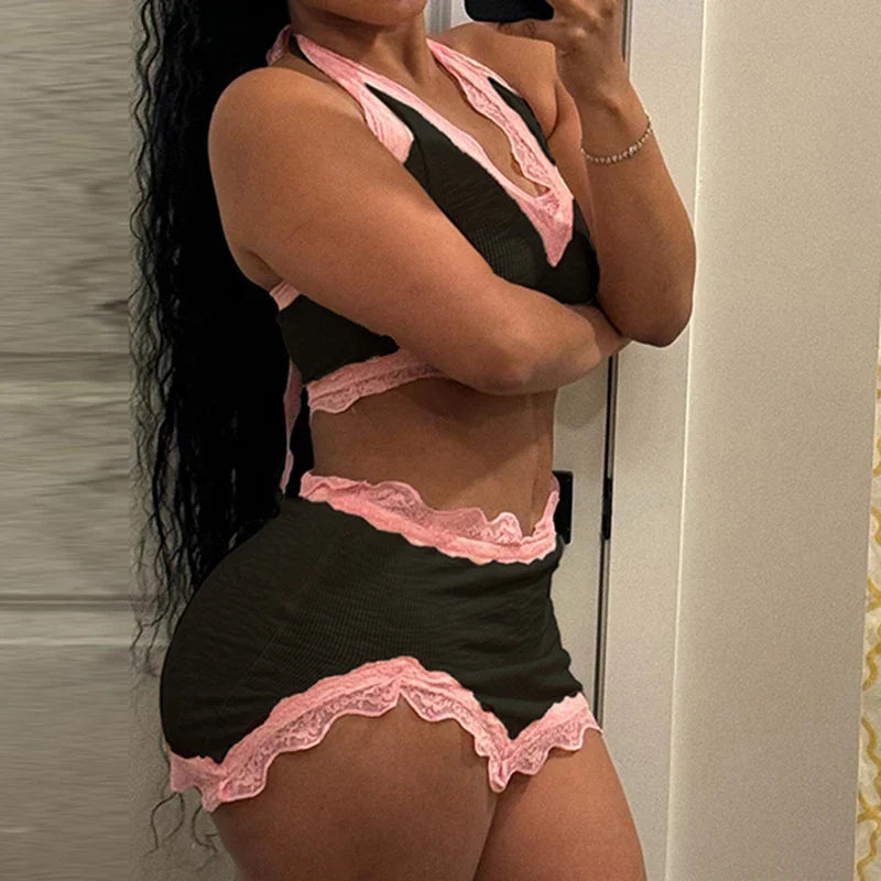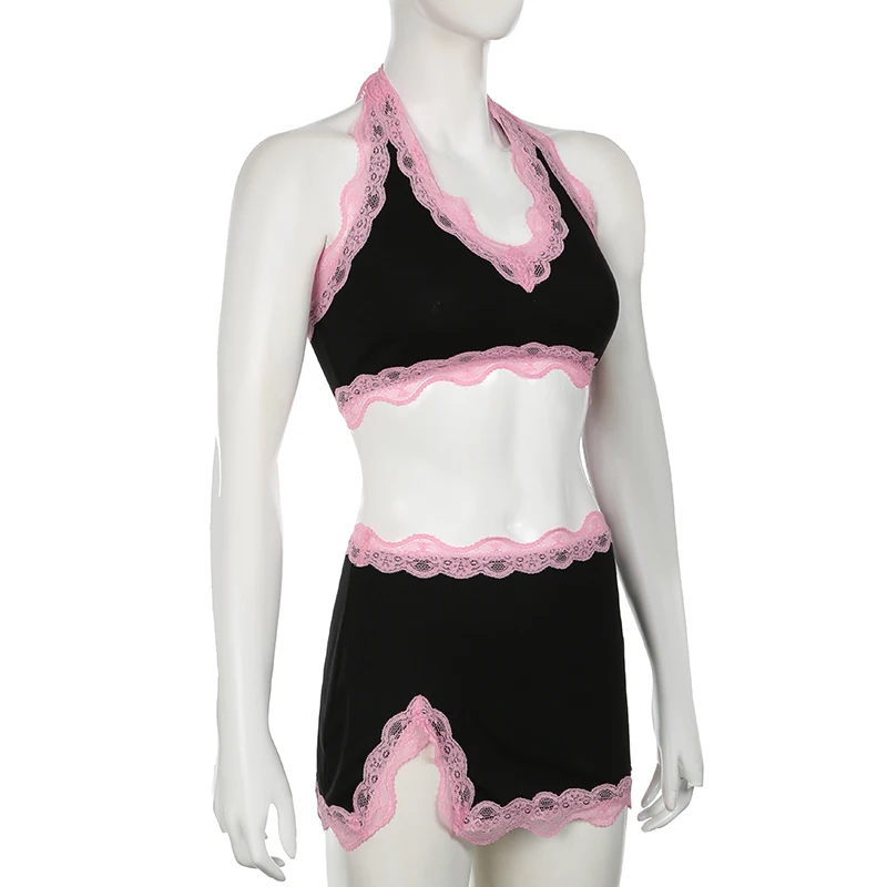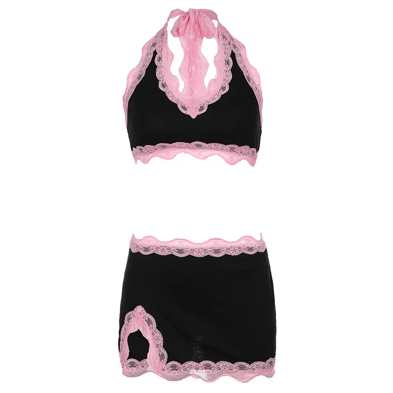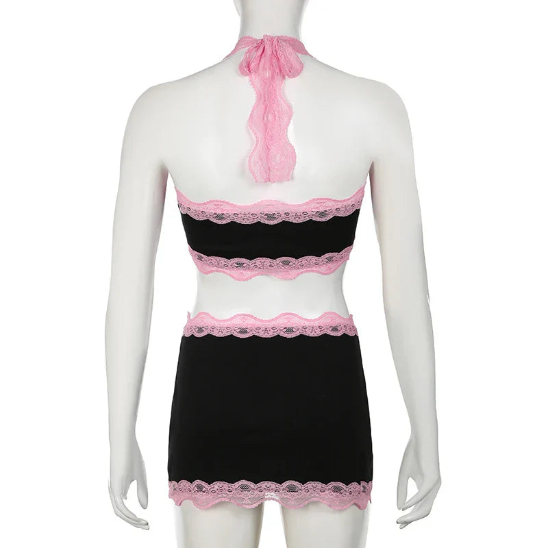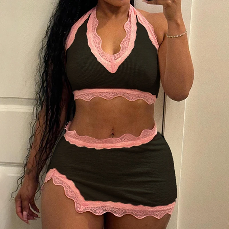 Fashion Sweet Sexy Summer Two Pieces Sets Women Club Party Bodycon Halter Top+Mini Skirts Lace Trim Coquette Clothes