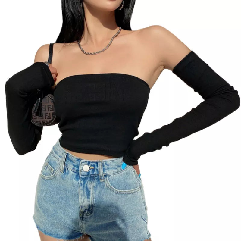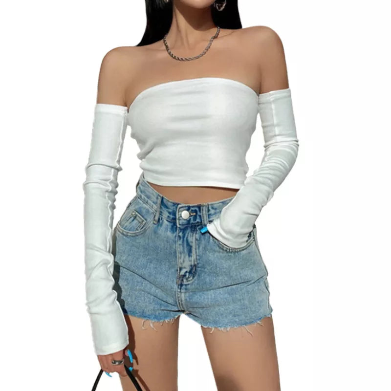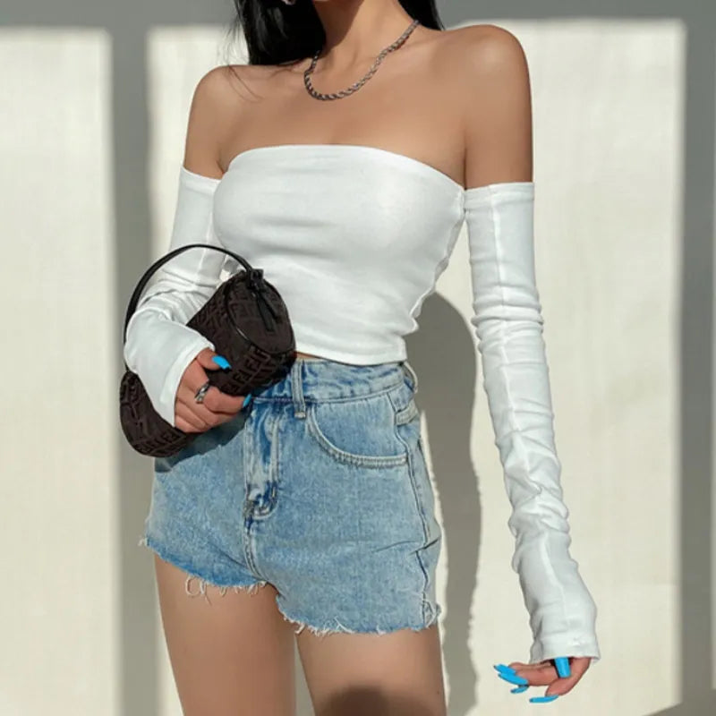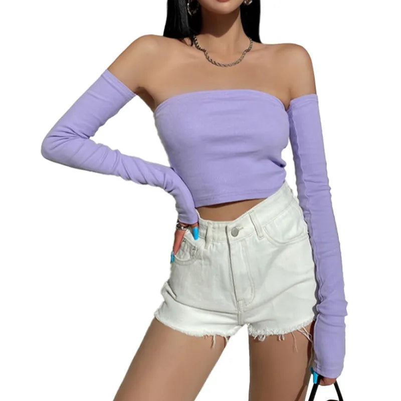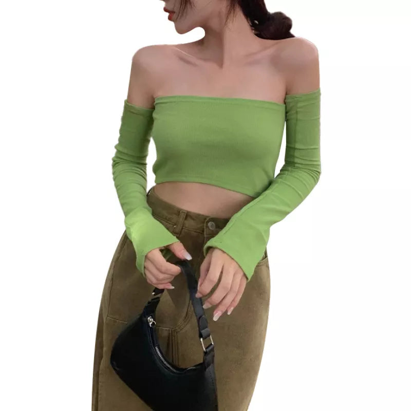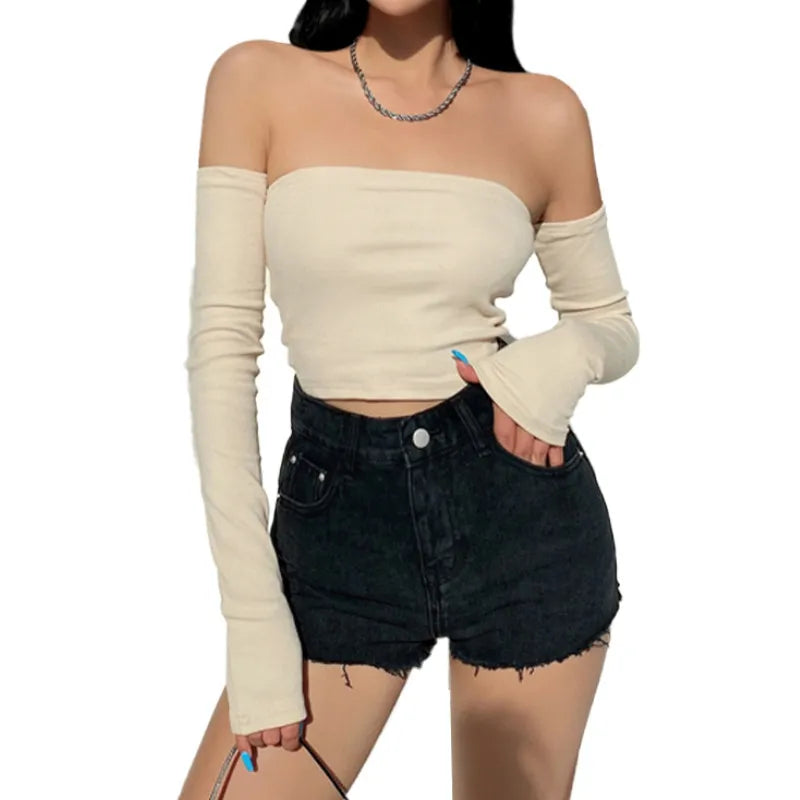 Female Crop Tops T-shirts, Solid Color Boat Neck Off Shoulder Sexy Tops Pullover with Long Sleeves for Summer Club Wear