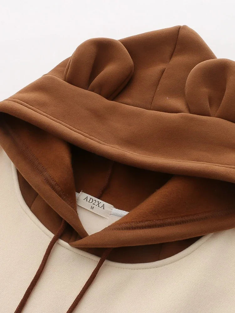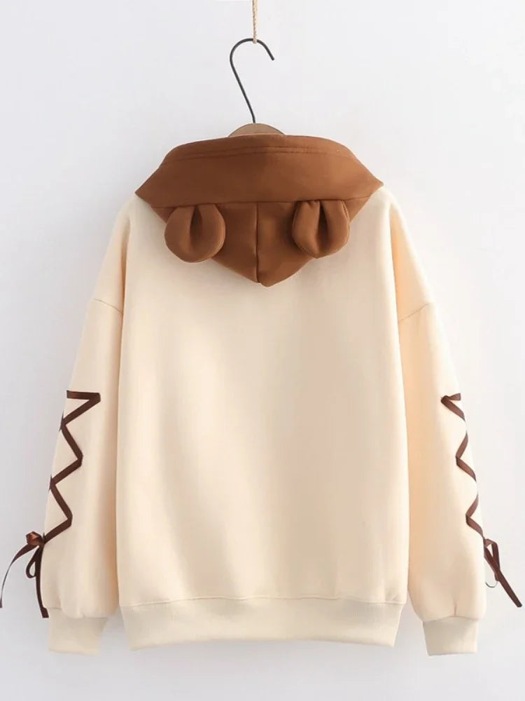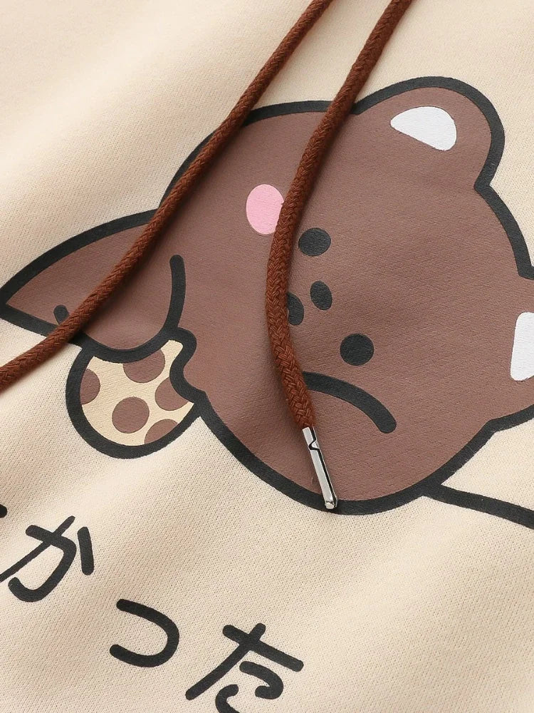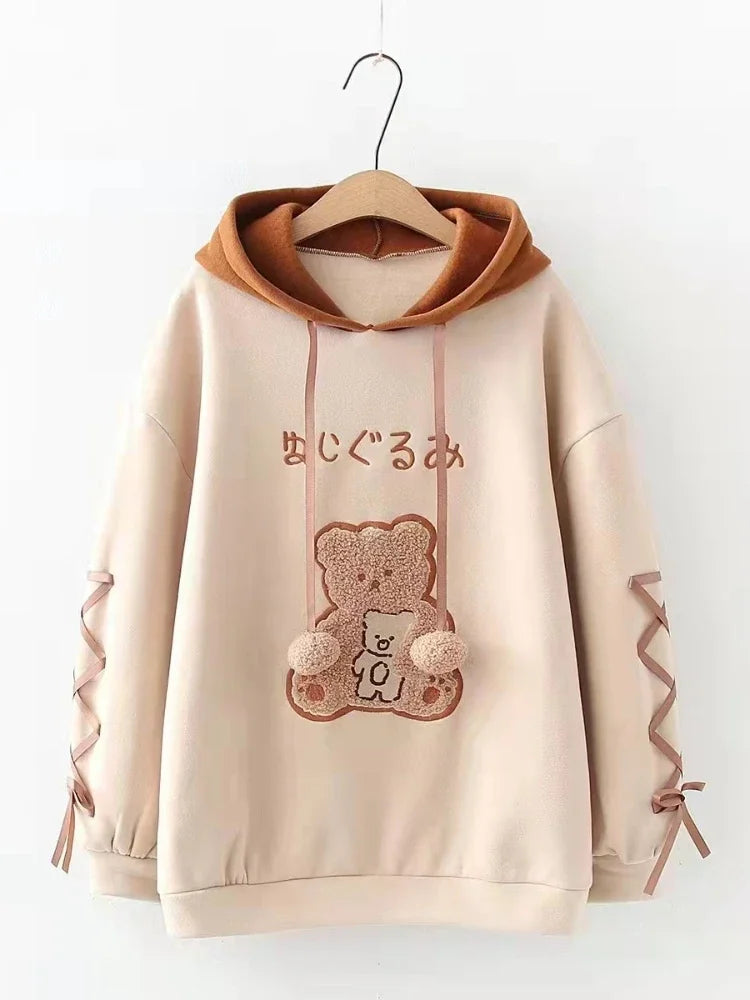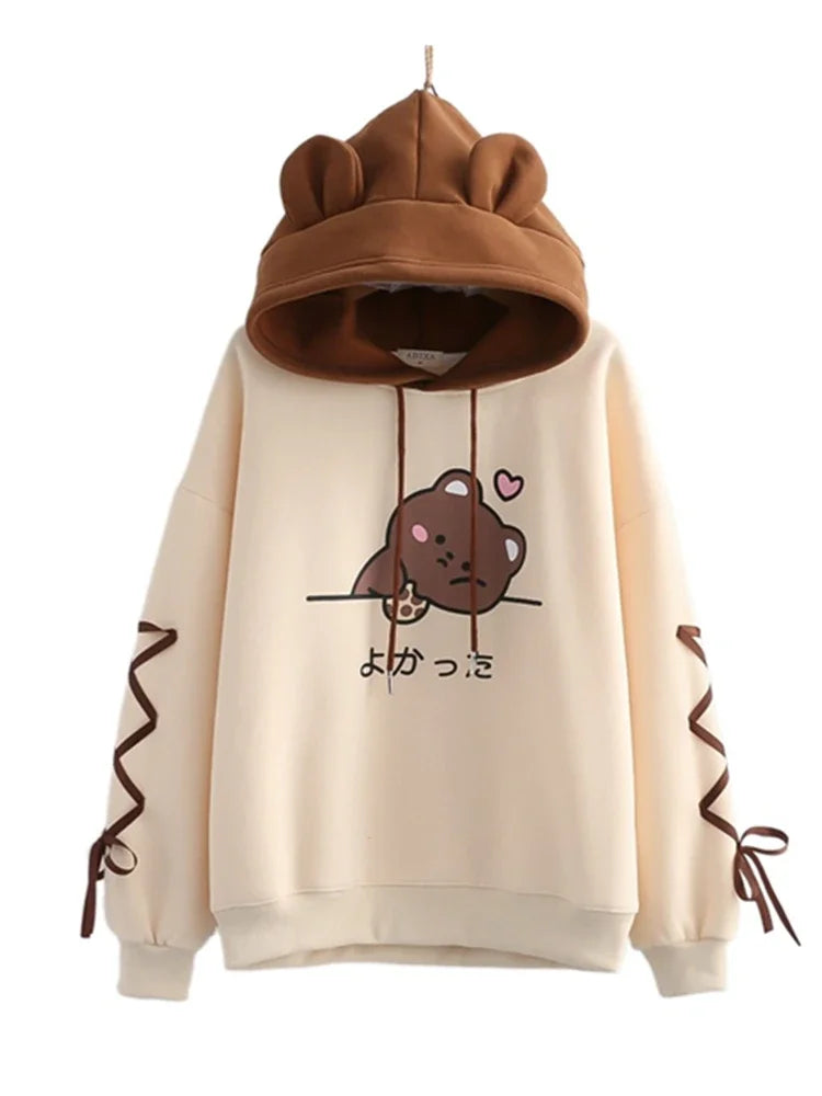 Fleece Women Kawaii Hoodies Winter Harajuku Cartoon Bear Print Cute Warm Hooded Sweatshirts Casual Drawstring Pullover