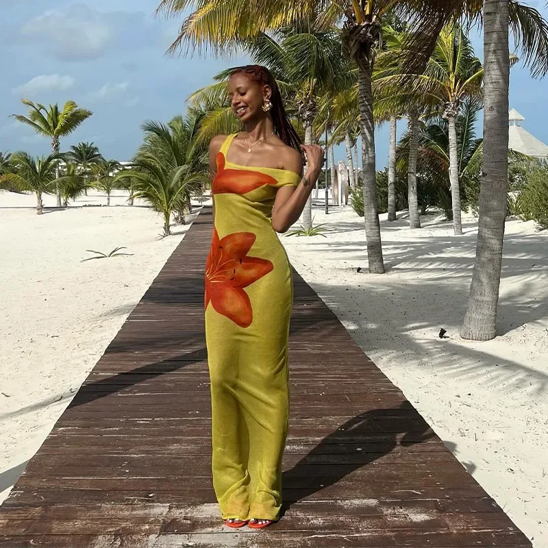 Flower Printed See Through Sleeveless Dress Women Fashion Diagonal Collar Long Robes Summer Female Beach Holiday Dresses