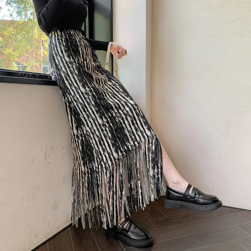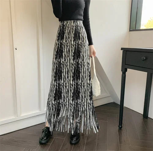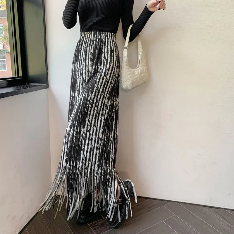 maoxiangshop French Chic Long Skirts for Women Tie-dye Printed Tassel High Waist Female Sheath Skirt Ladies Streetwear Maxi Skirt