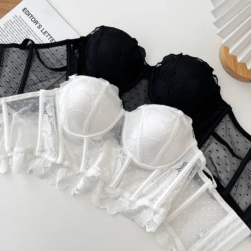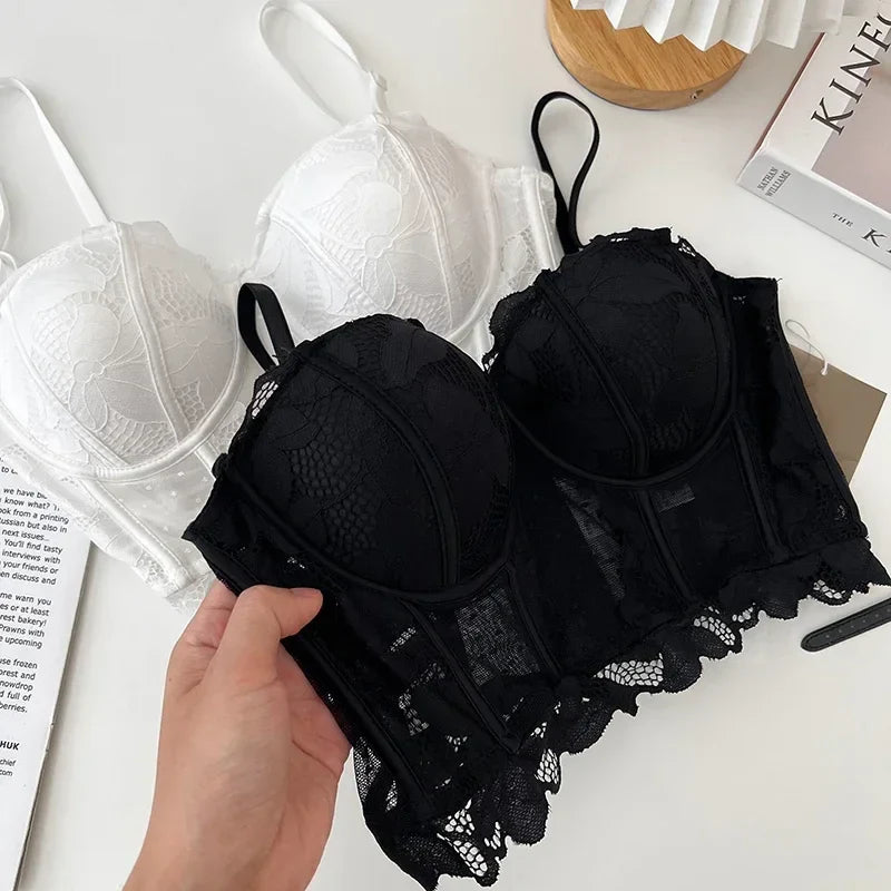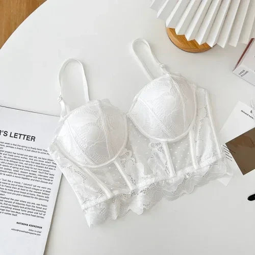 maoxiangshop French Chic Sexy Crop Top Women Lace Sheer Spaghetti Strap Corselet Female Tank Tops Built in Bra Backless Skinny Camis