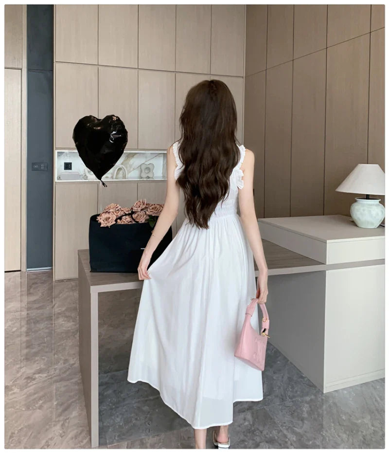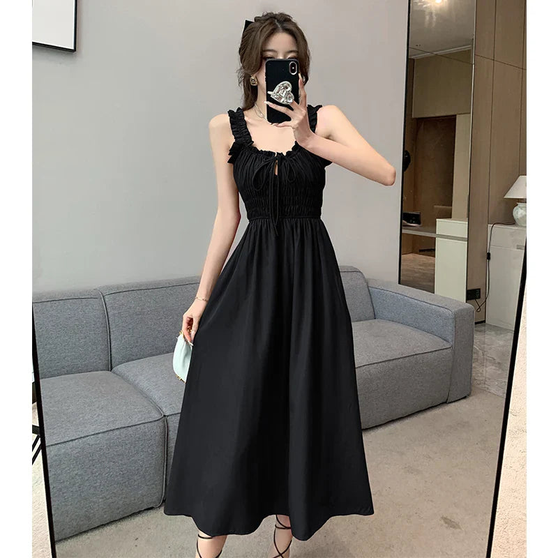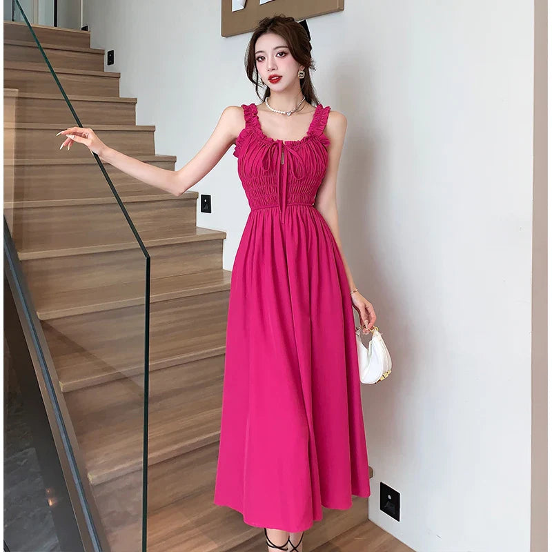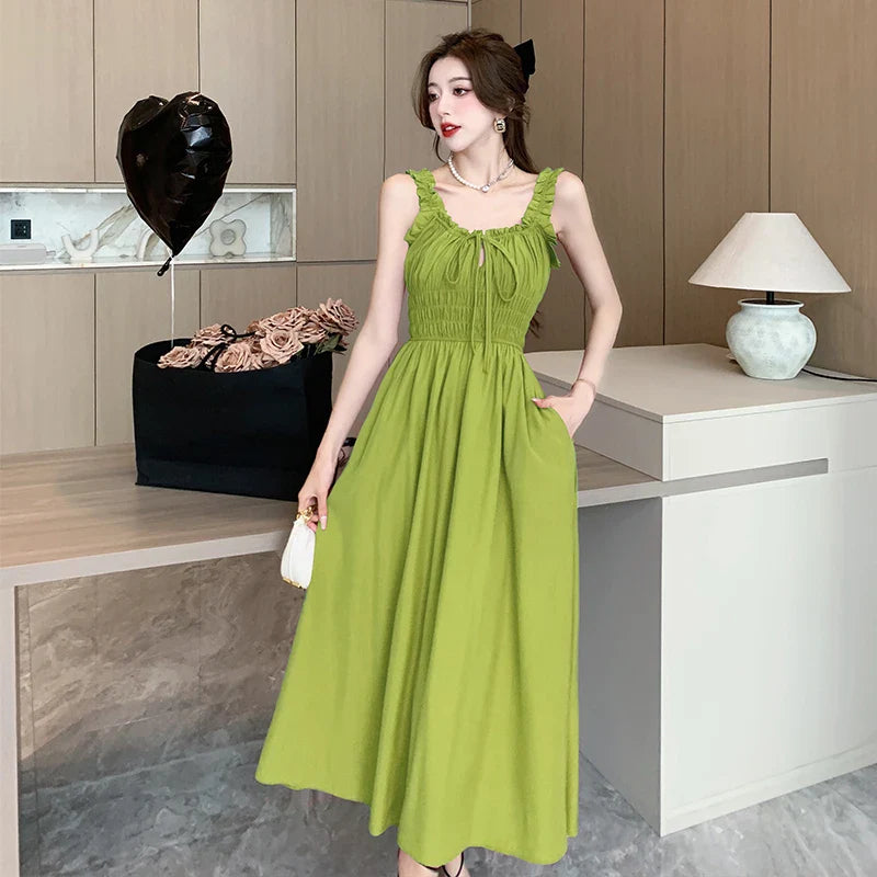 French Vintage Pleats Long Dress Women Summer Korean Sleeveless Camisole Backless Beach Dress Elegant Sexy Evening Party Dresses
