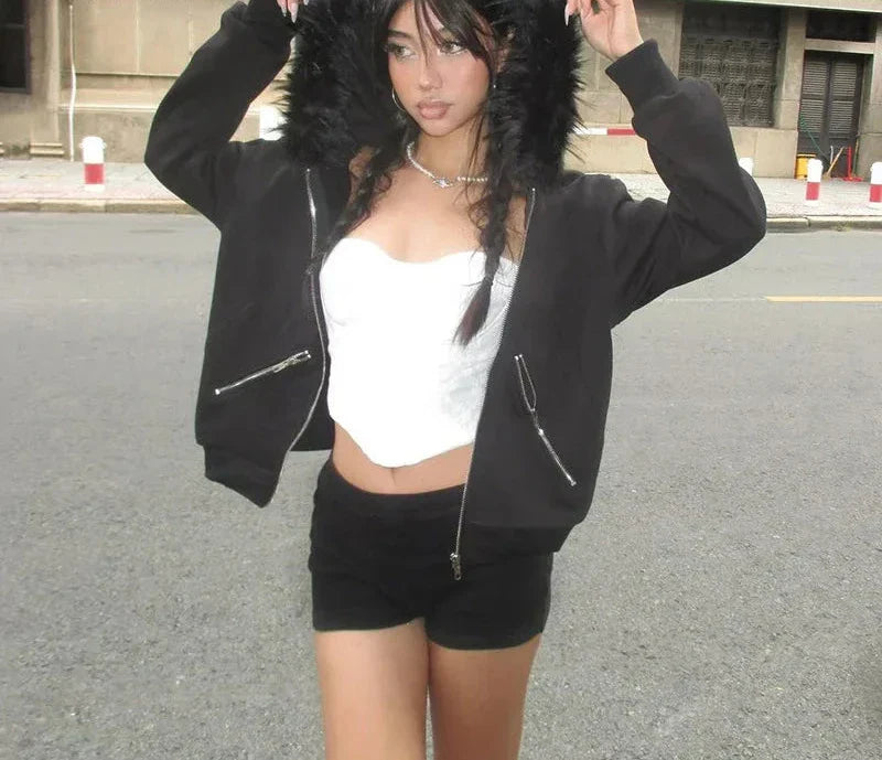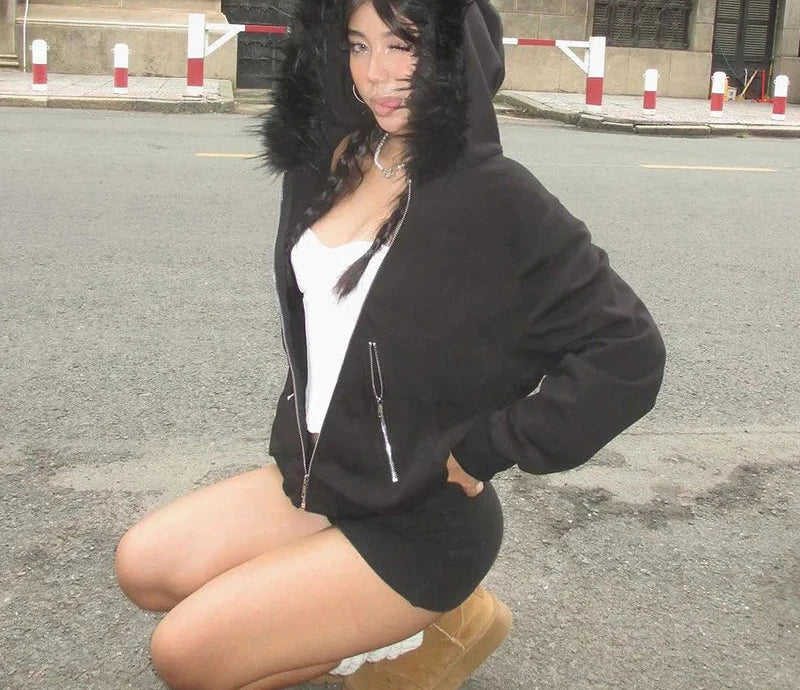 Furry Faux Fur Trim Zipper Hoodie Women Y2k Streetwear Fashion Black Jackets and Coats Fall Winter Clothes P67-DI30