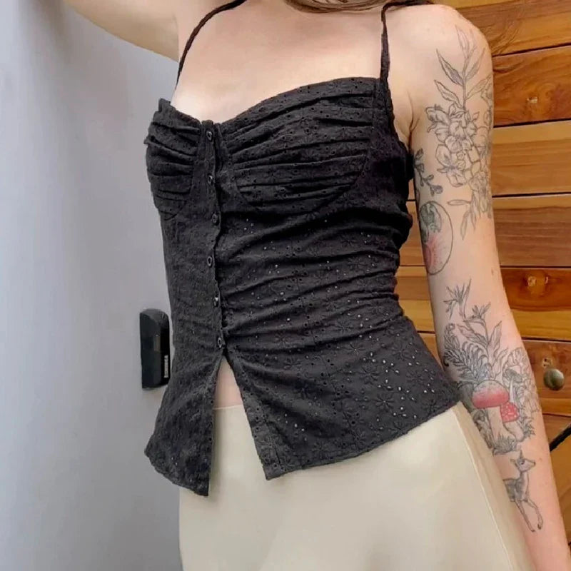 maoxiangshop-hirigin��Women Floral Hollow Crop Tops y2k Fairycore Grunge Spaghetti Strap Sleeveless Button Camisole Kawaii Tank Streetwear