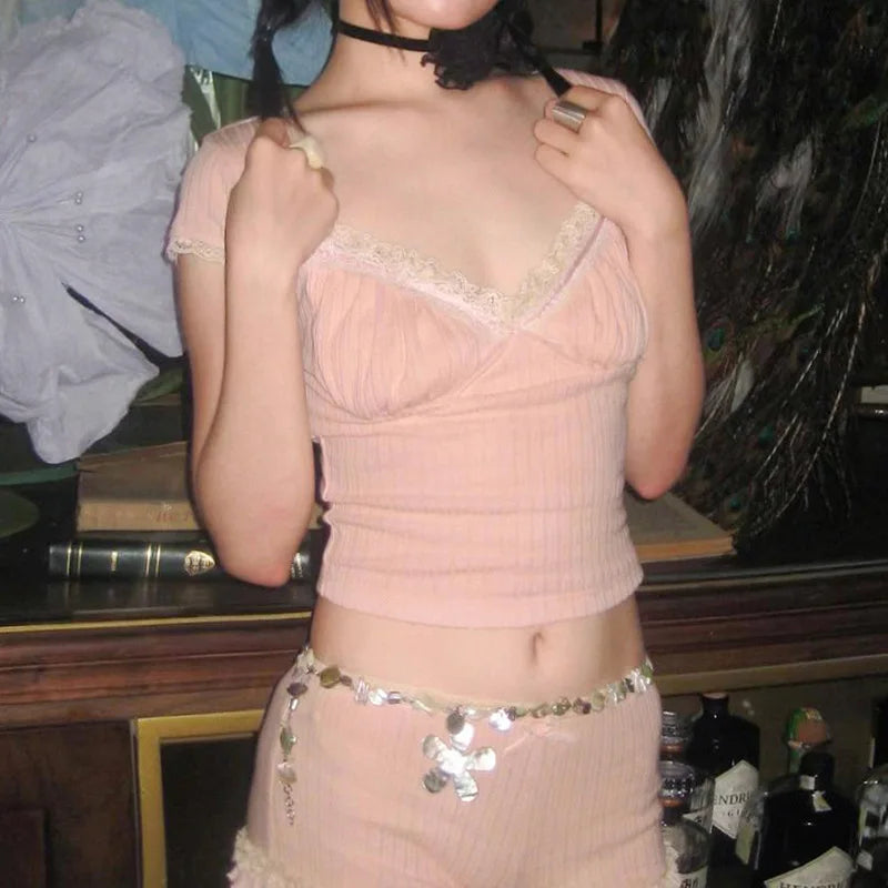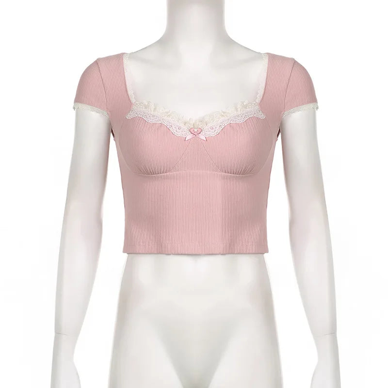 maoxiangshop-Women Fairycore T-Shirt Grunge Lace Trim Sweetheart Neck Ribbed Slim Fit Crop Tops Summer Low Cut Short Sleeve Tee