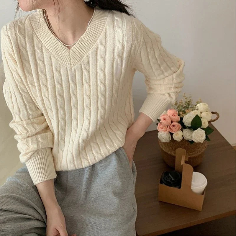 maoxiangshop-Women's Twist Pullover Knitted Sweater Solid Casual Jumper Fall Winter Vintage Embroidered V-Neck Long Sleeve Top