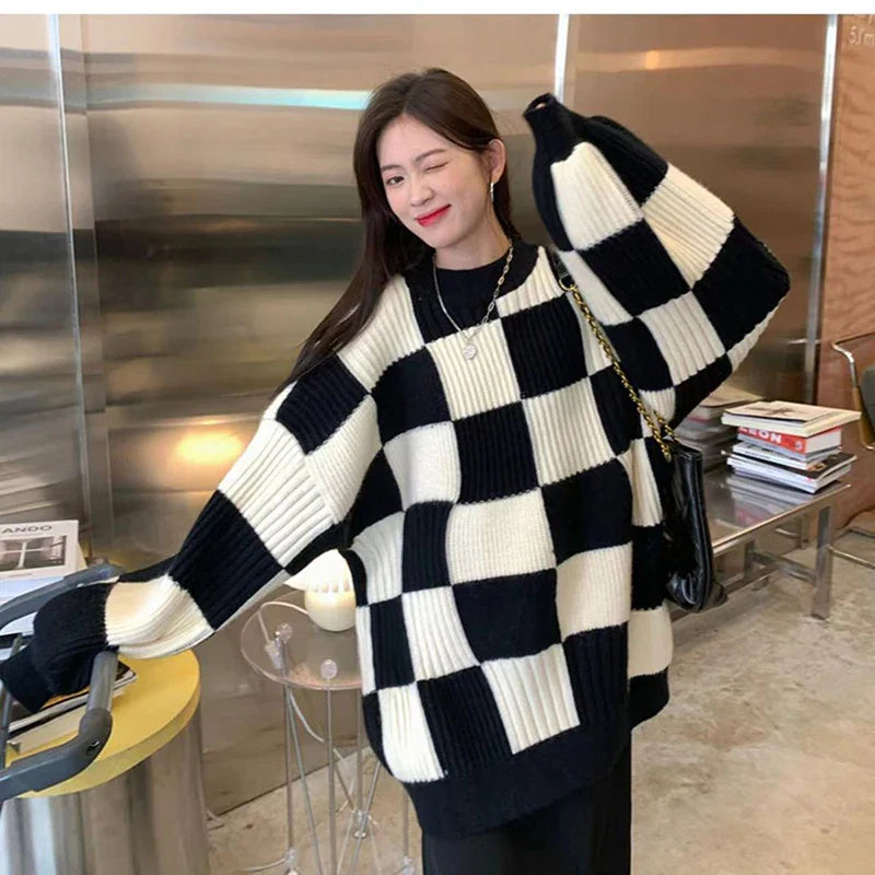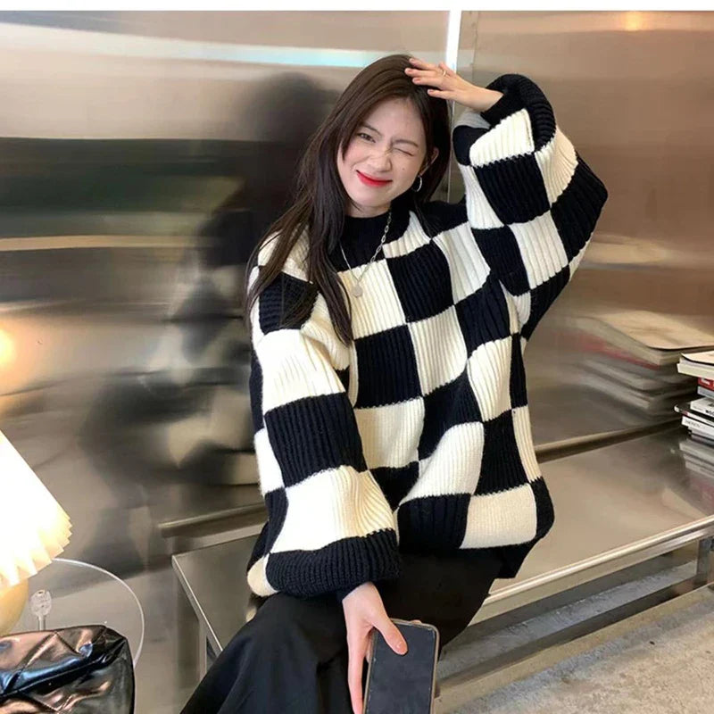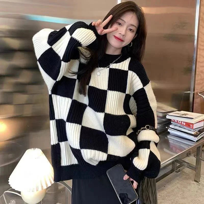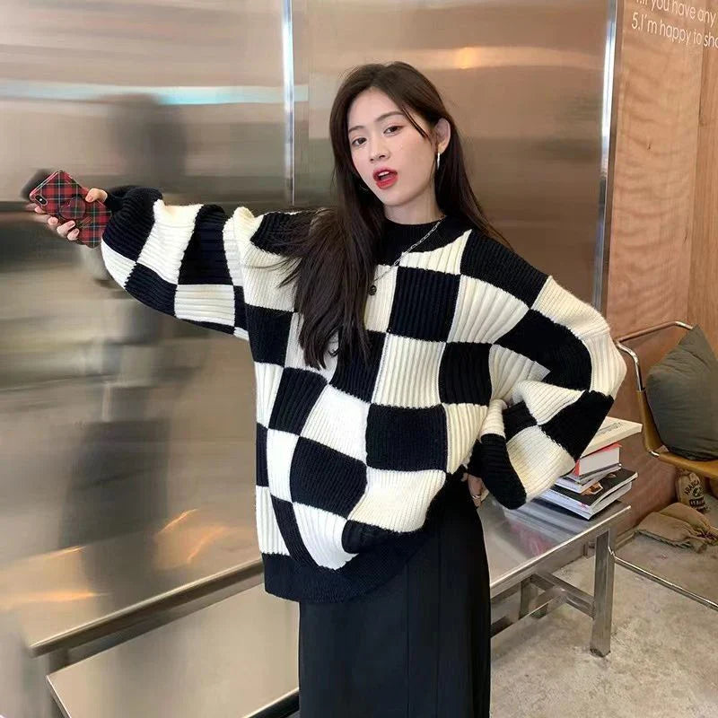 Women Checkerboard Knitted Sweater Autumn Korean Casual Warm Loose Long Sleeve Top Female Streetwear All Watch Jumper New