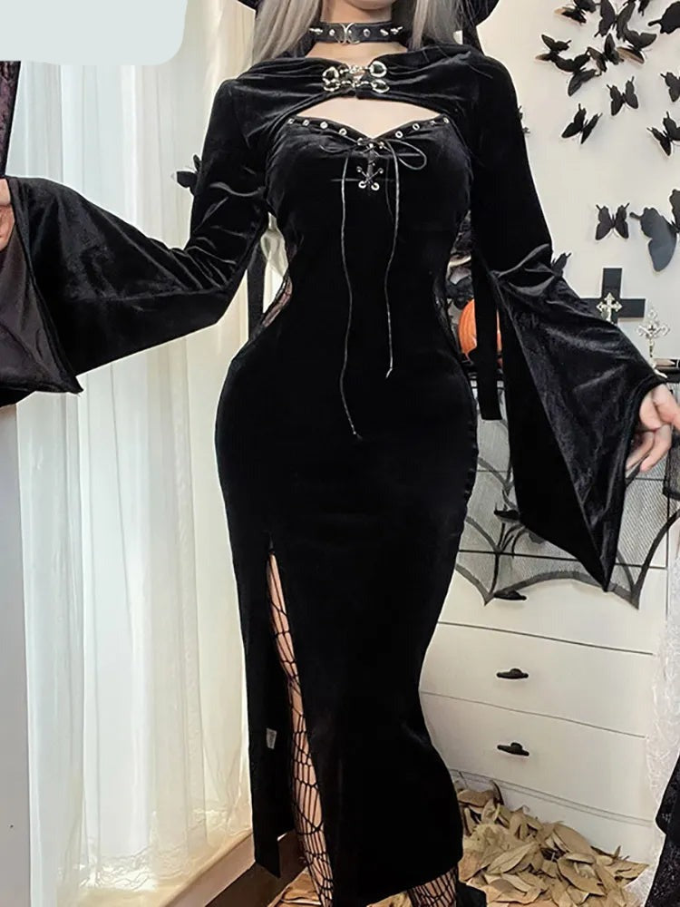 maoxiangshop Bandage Gothic Elegant Women High Split Dresses Lace Side Transprent Grunge Midi Dress Flare Sleeve Alt Crop Shrug Top