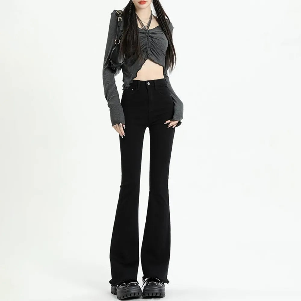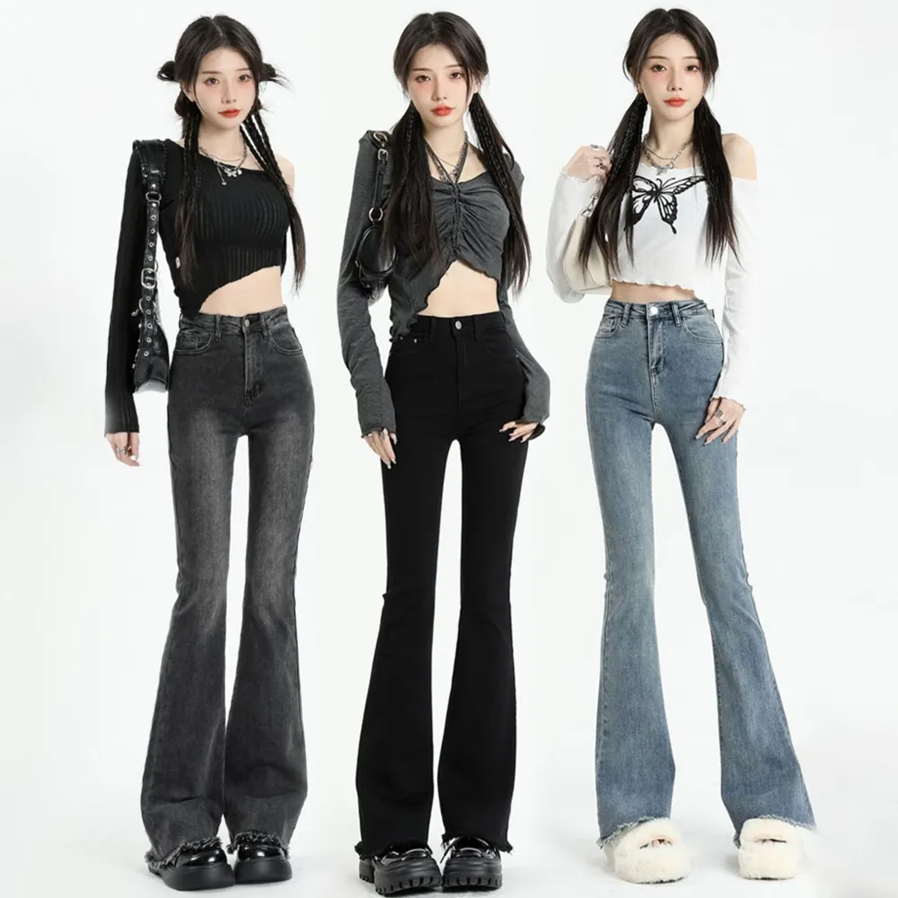 Gray Flared Jeans Women's Spring Autumn High-waisted Slim-fit Pants Retro Y2K Street Female Denim Trousers