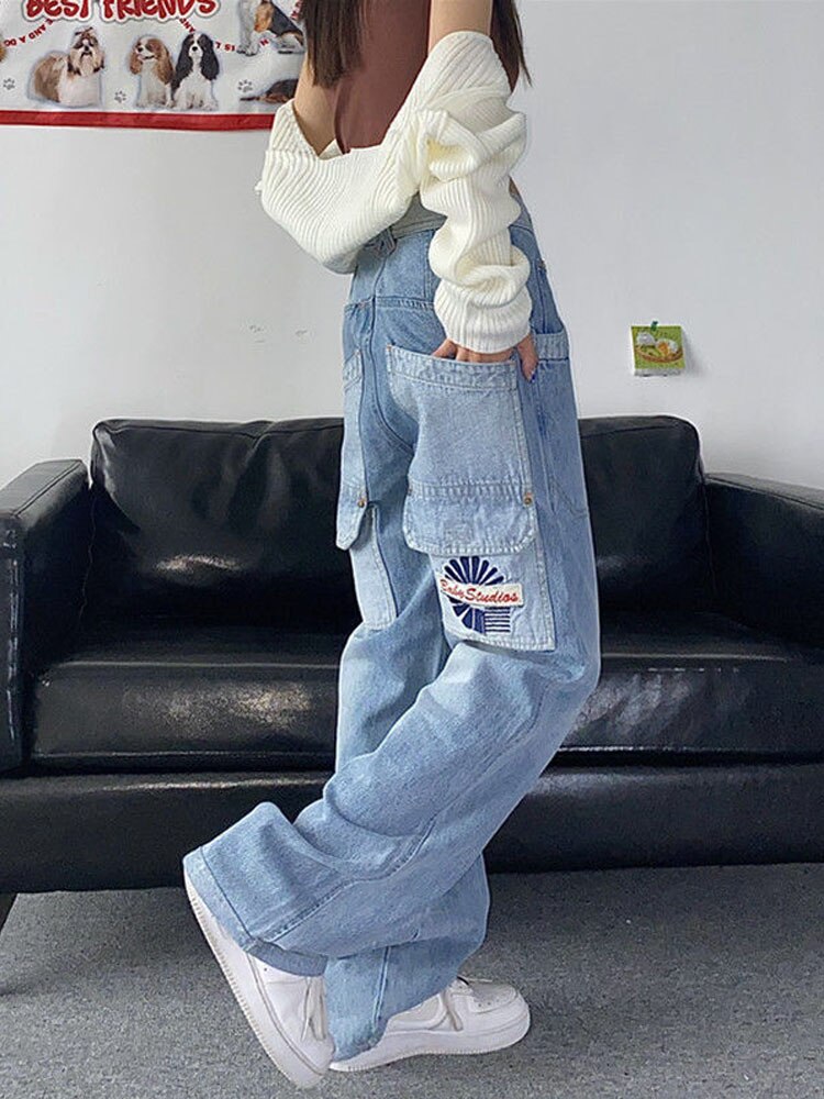 Harajuku Vintage Cargo high waisted Jeans Women Y2k Hip Hop Baggy Wide Leg Denim Pants Casual Loose Trousers Streetwear Pockets
