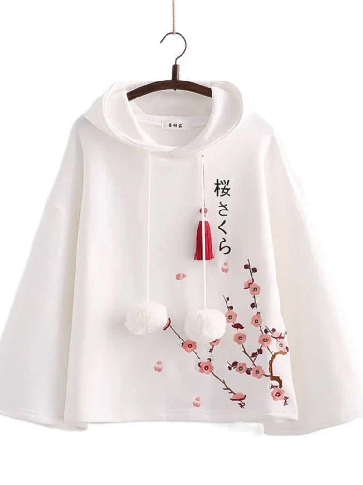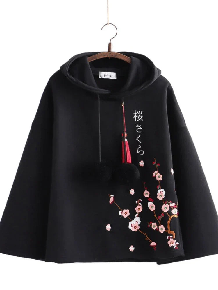 Harakuju Women Hoodies Floral Embroidery Hooded Sweatshirts Winter Full Sleeve Sweet Style Female Cotton Kawaii Pullover