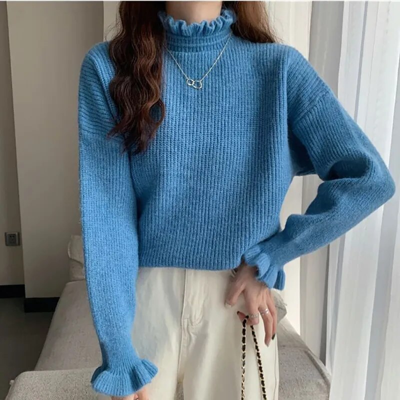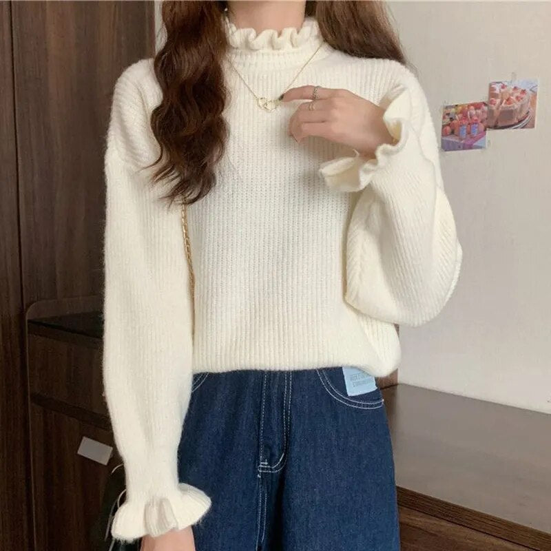 maoxiangshop Women Ruffles Thicken Warm Sweater Mock Neck Flare Sleeve Sweet Pullovers Solid Casual Sweater For Women Fall Winter