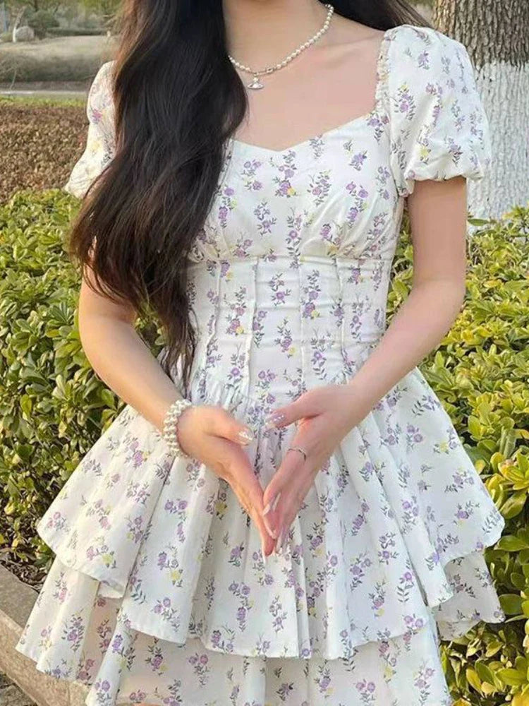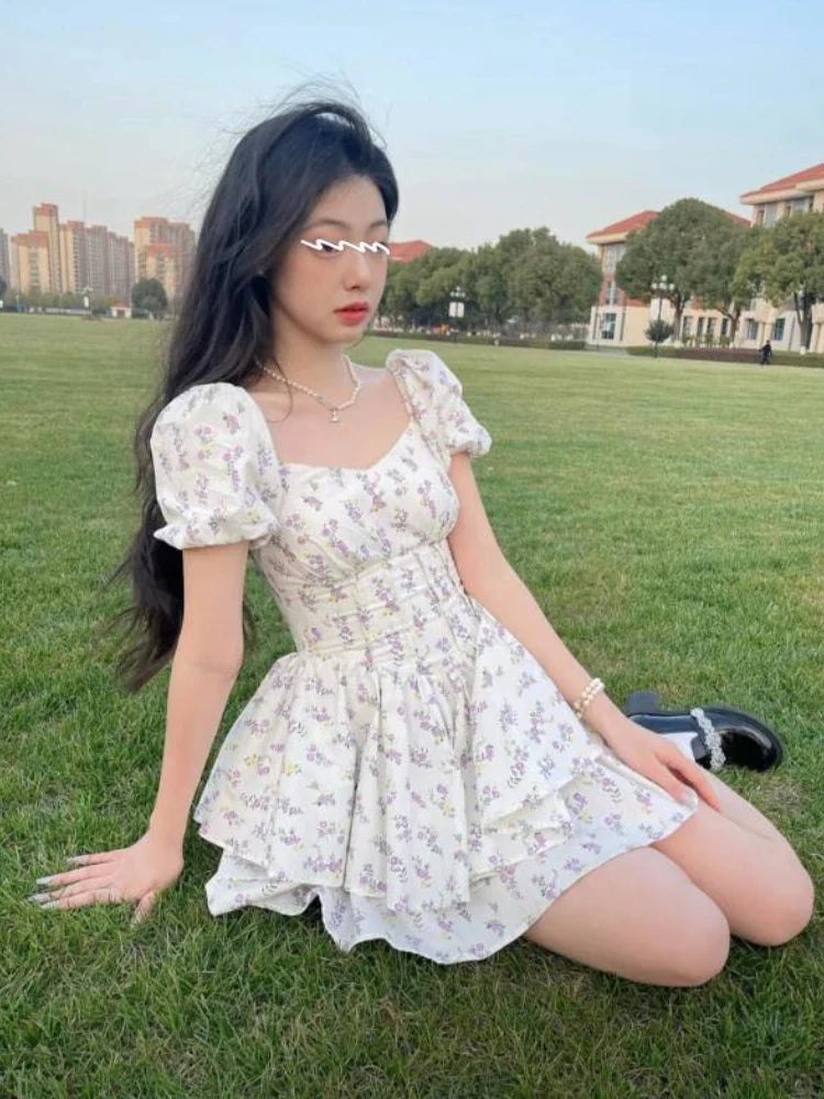 High Waist Dress Women Summer Floral Sweet Square Collar Puff Sleeve Princess Girlish Tender Elegant Korean Style Preppy Chic