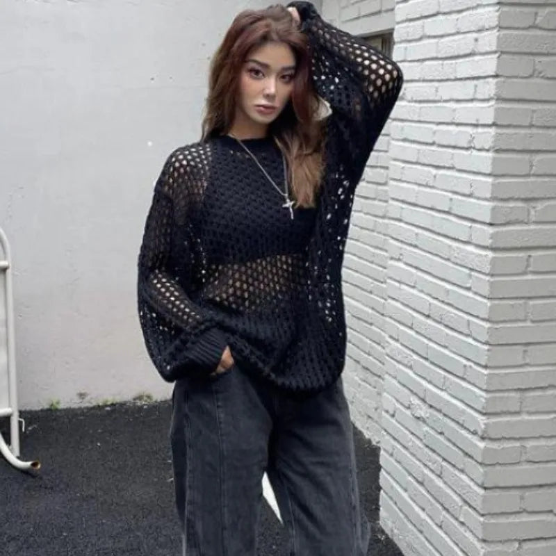 maoxiangshop Hollow Out Knit T-shirt Women Y2K Casual Loose Fishing Net Long Sleeve Female Top Summer Street White Lady Pullovers Tops