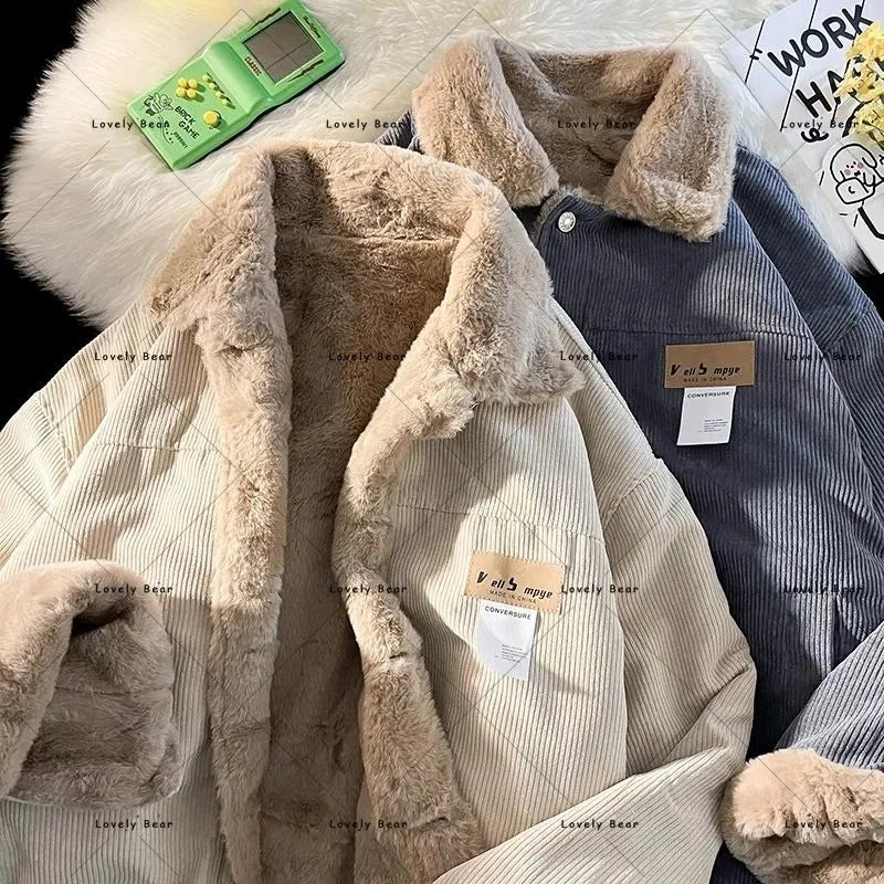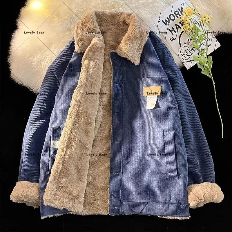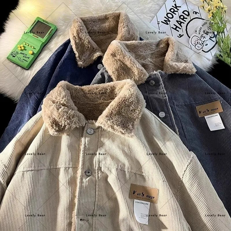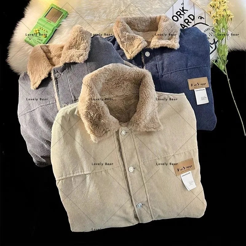 Hong Kong Style Retro Corduroy Coat Y2k Winter Fashion Loose Lamb Casual Joker Cotton-padded Jacket Coat For Men And Women Top