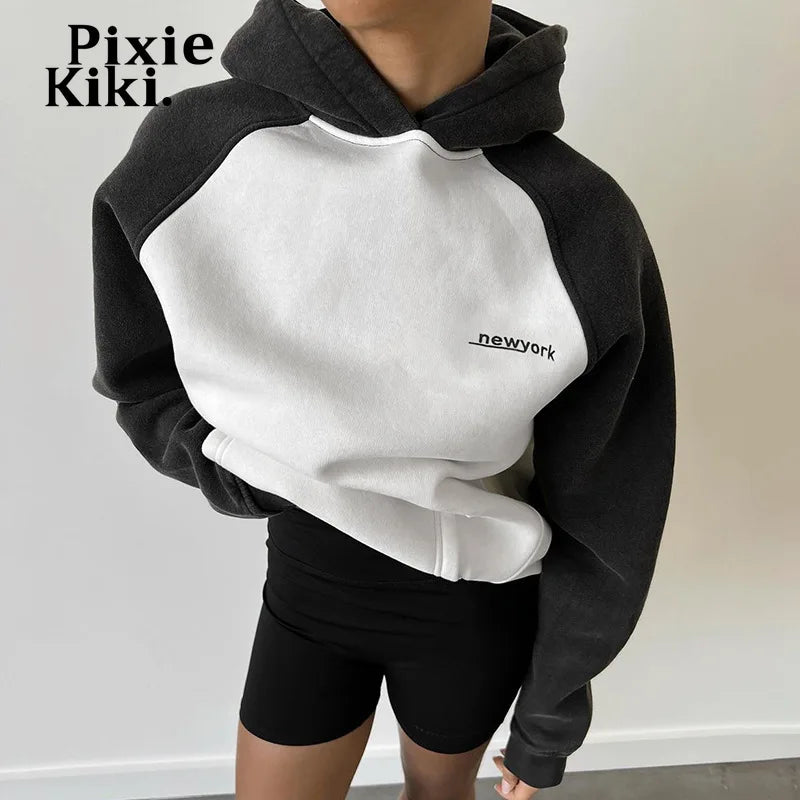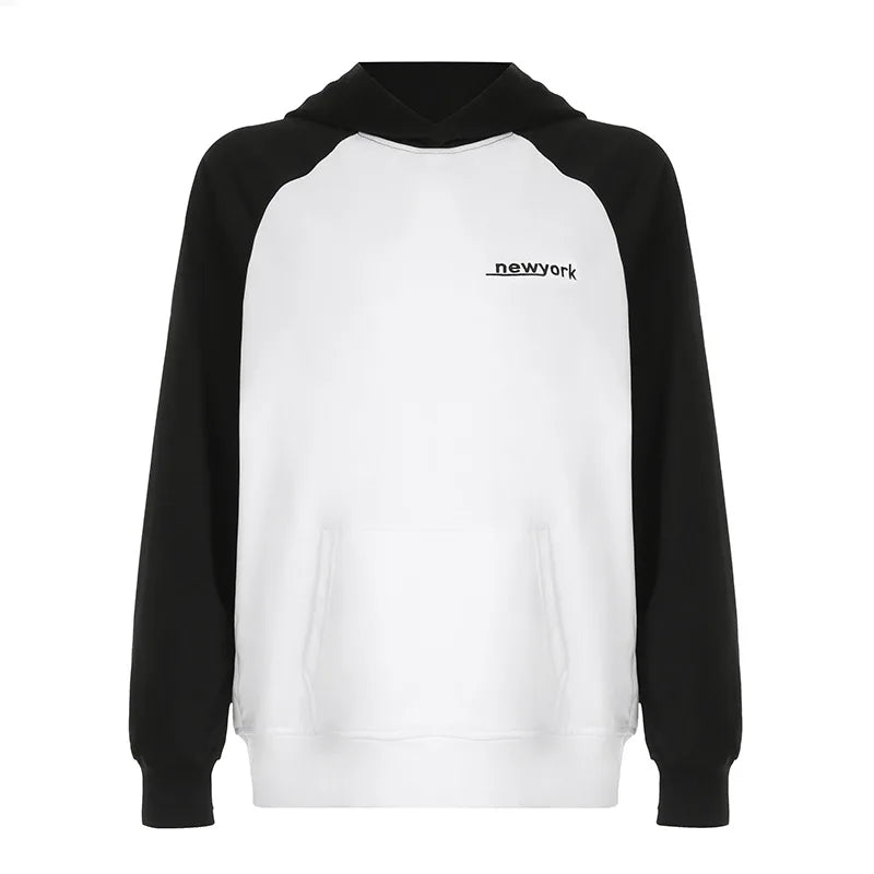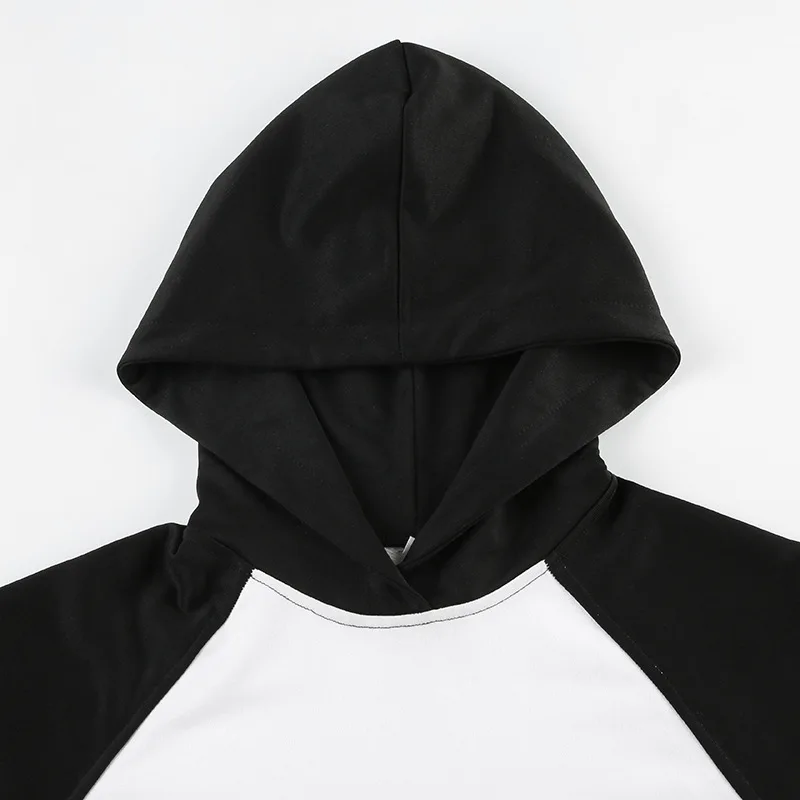 Hooded Sweatshirts Letter Print Black and White Patchwork Casual Loose Pullovers Women Long Sleeve Tees P67-DZ49