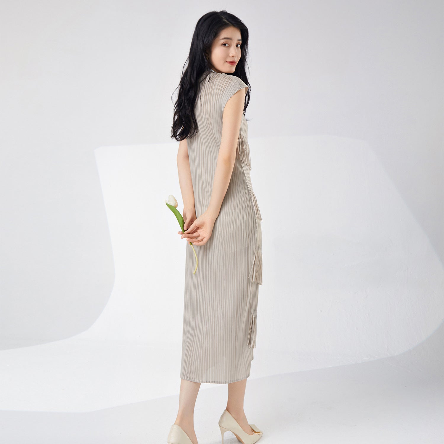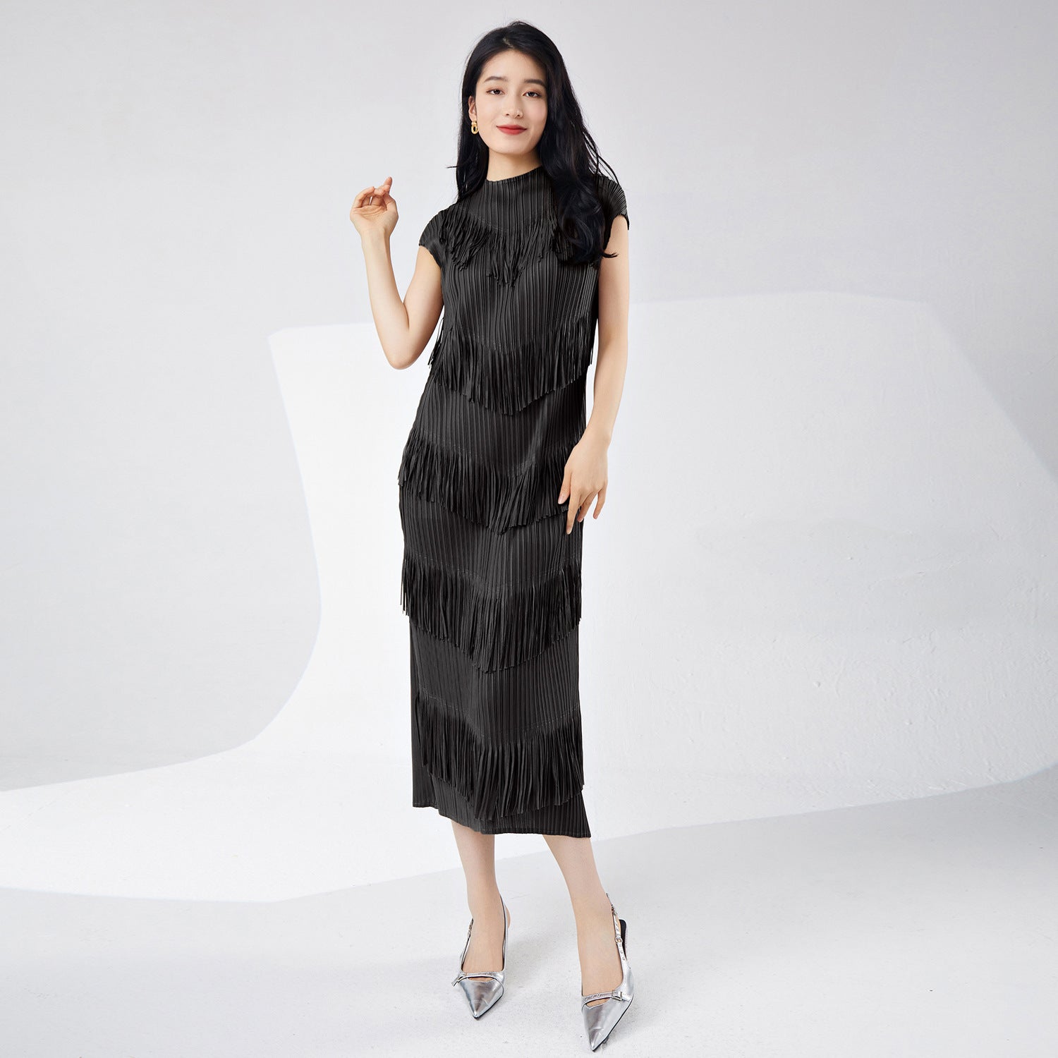 Hot-selling summer women's pleated dress, high-end sense fringed short-sleeved temperament, elegant straight medium and long skirt, Popular style