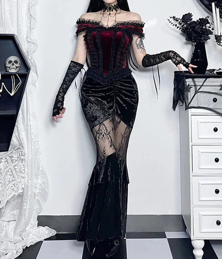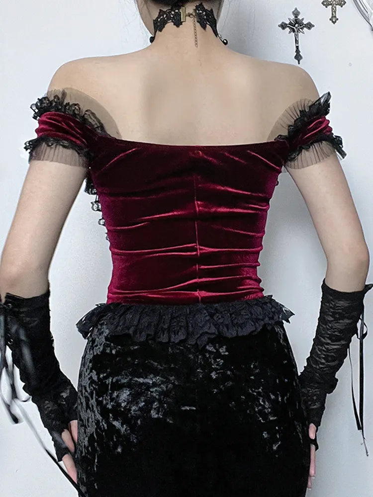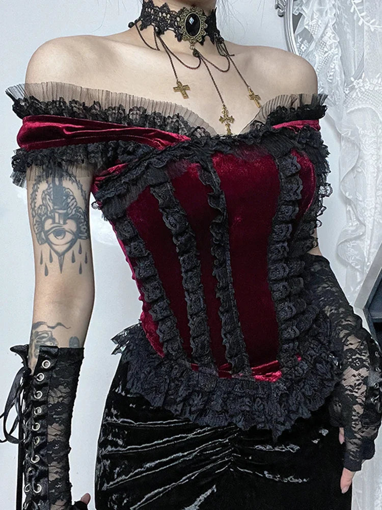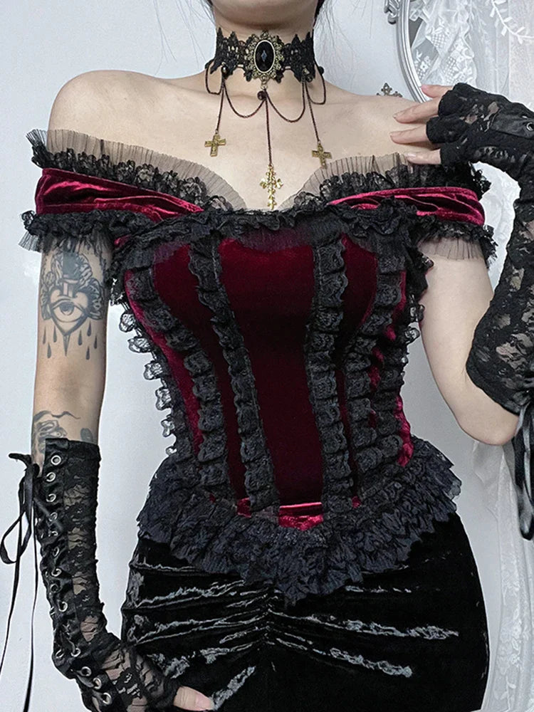 maoxiangshop Harajuku Velet Lace Trim Top Women Mall Goth Aesthetic Grunge T Shirt Corset Crop Tank Top E-girl Emo Streetwear