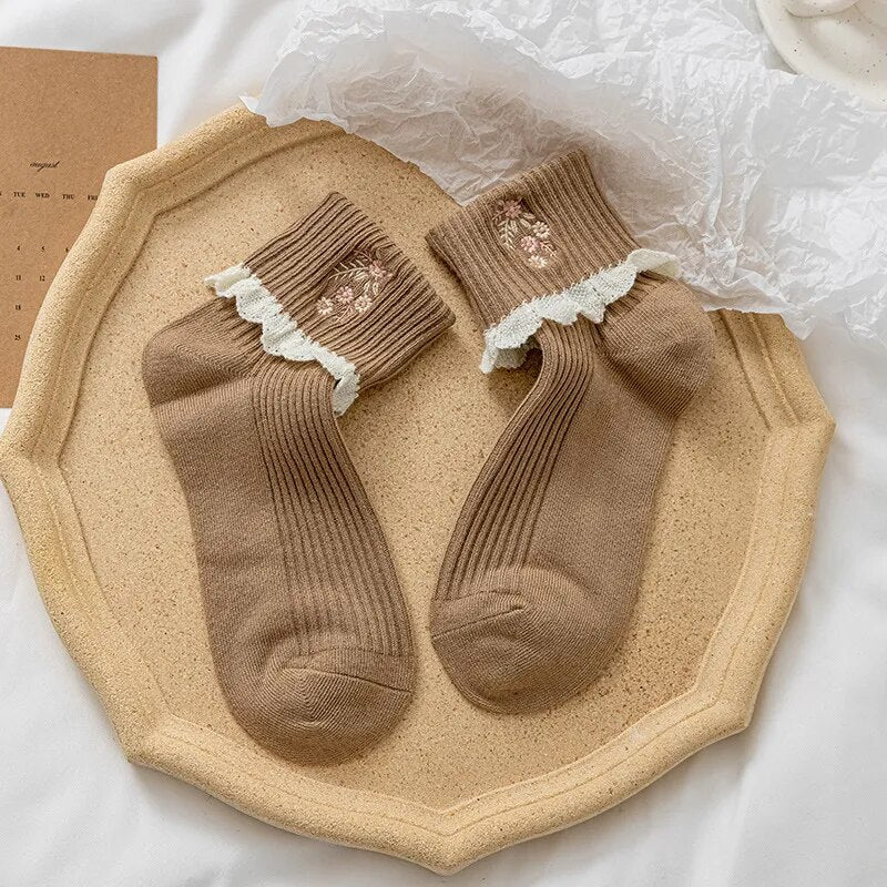 maoxiangshop Japanese Kawaii Cute Socks JK Lolita Lace Frilly Ruffle Socks Women Fashion Flower Embroidery Harajuku Retro Vintage Crew Socks