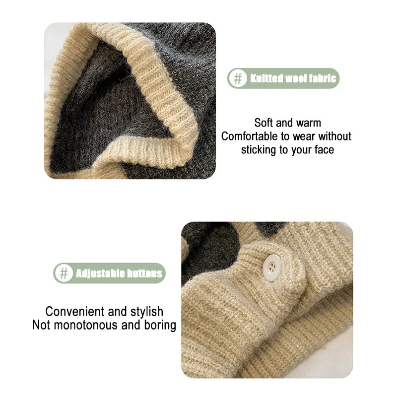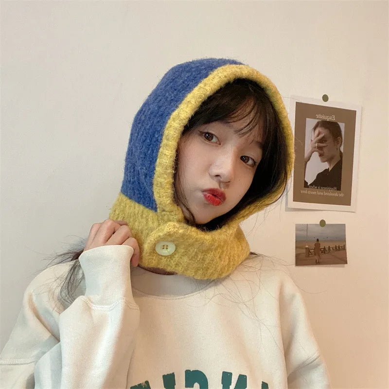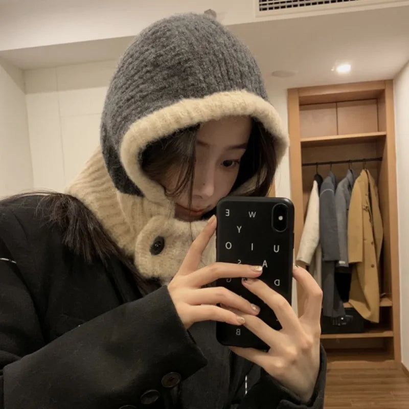 maoxiangshop Japanese Retro Balaclava Hat Winter Women Scarf Hat Set Neck Cold Proof Warm Knit Cap Female Fashion Color Matching Women's Hats