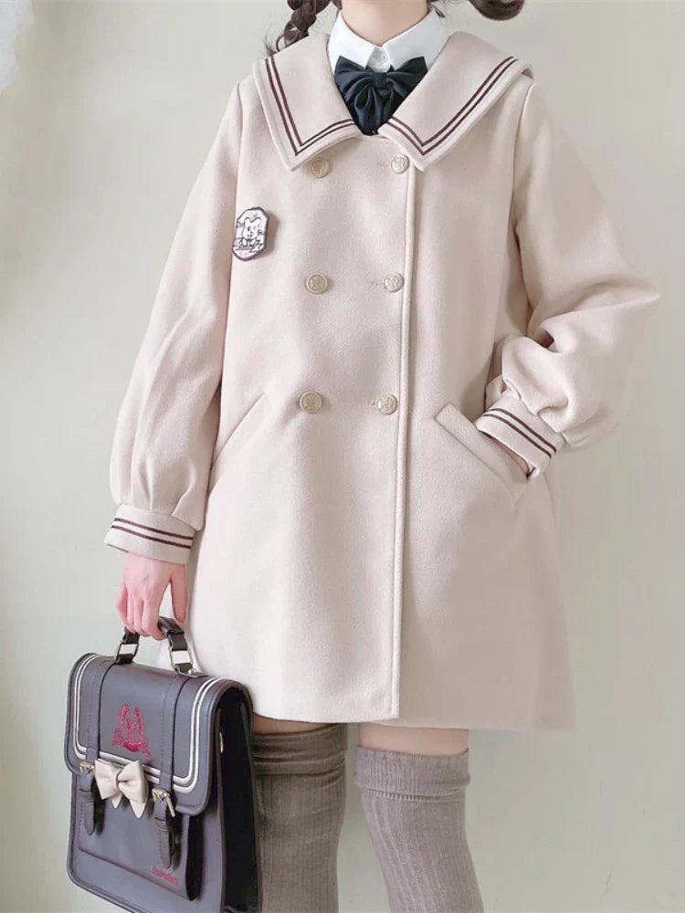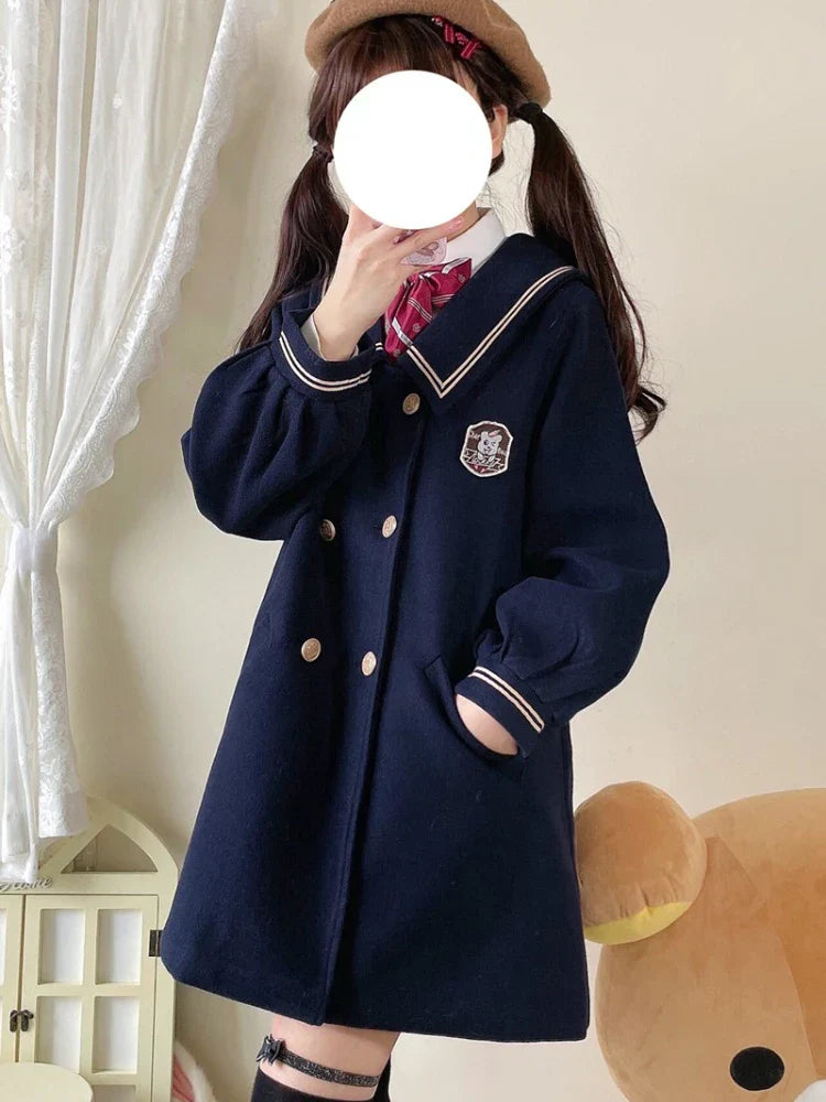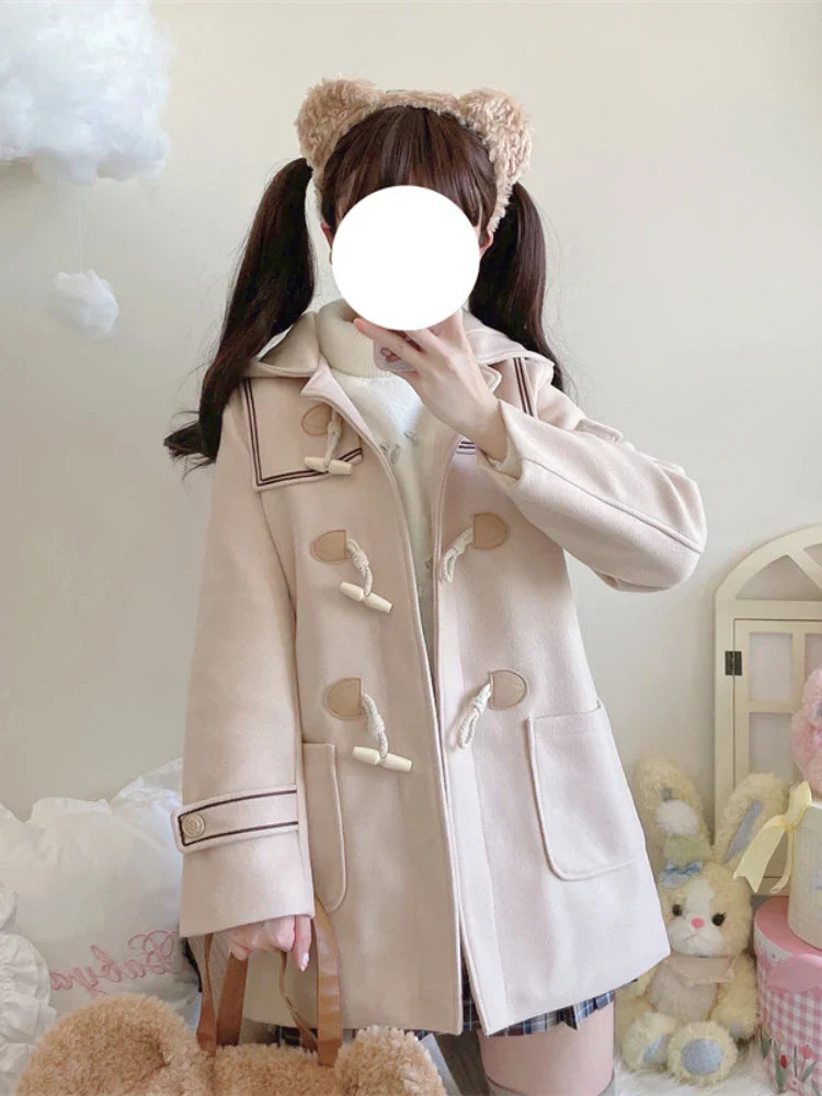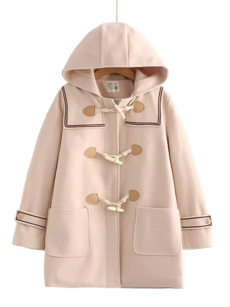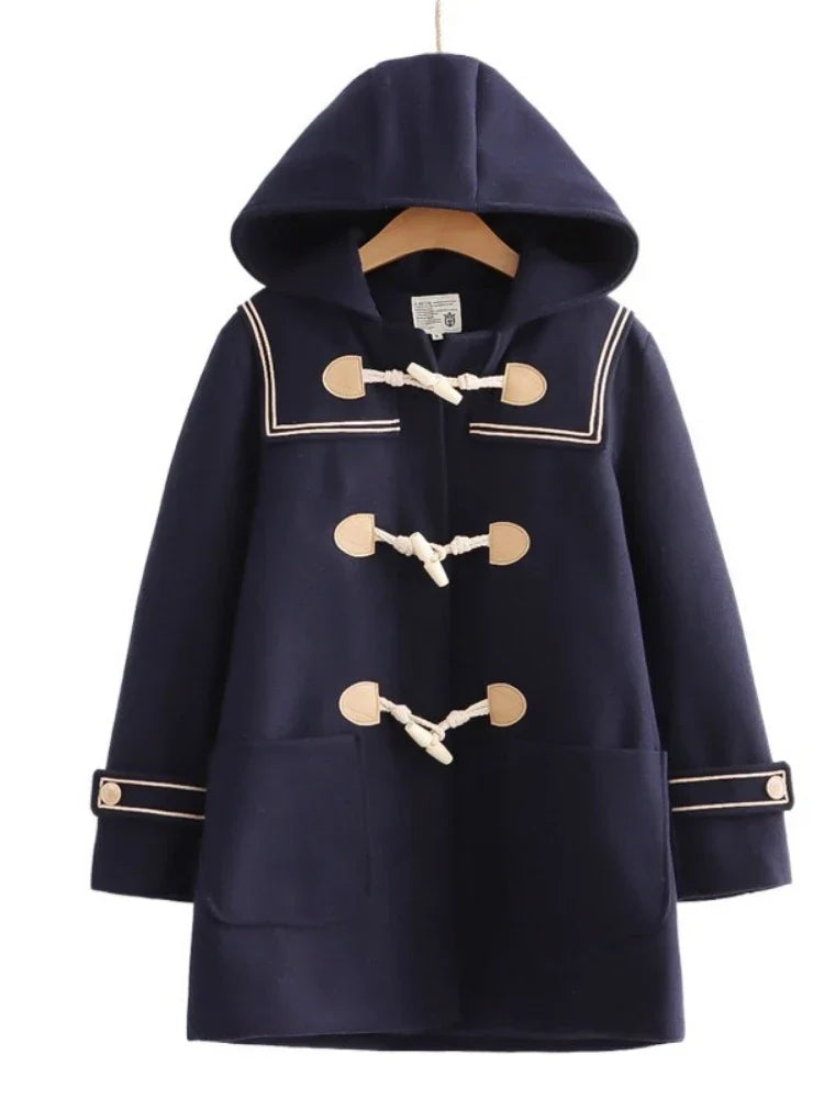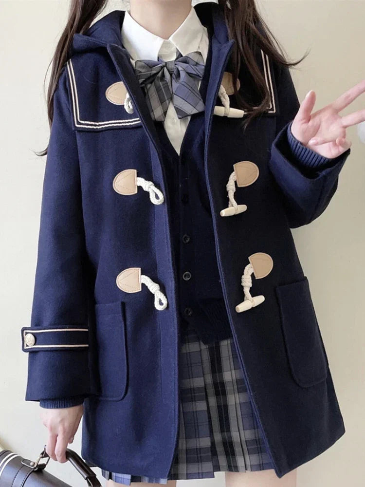 JK Style Girls Warm Wool Blends Straight Women Long Hooded Coat Jacket 2023 Winter Belt Button Female Warmness Preppy Outwear