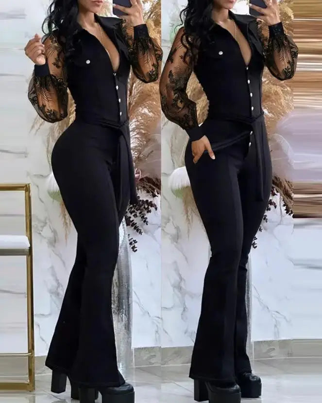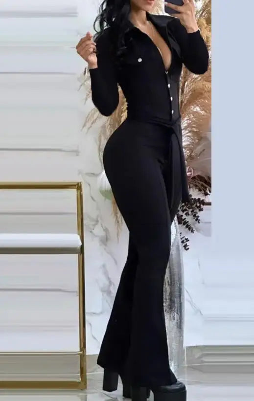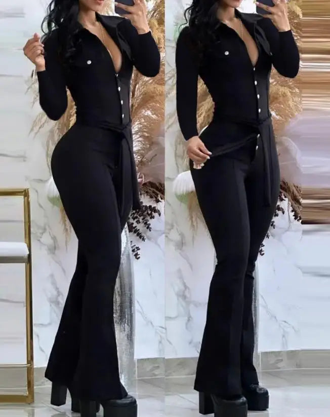 Jumpsuit Women Spring Fashion Buttoned Tied Detail Turn-Down Collar Plain Long Sleeves Skinny Daily Long Flared Jumpsuit