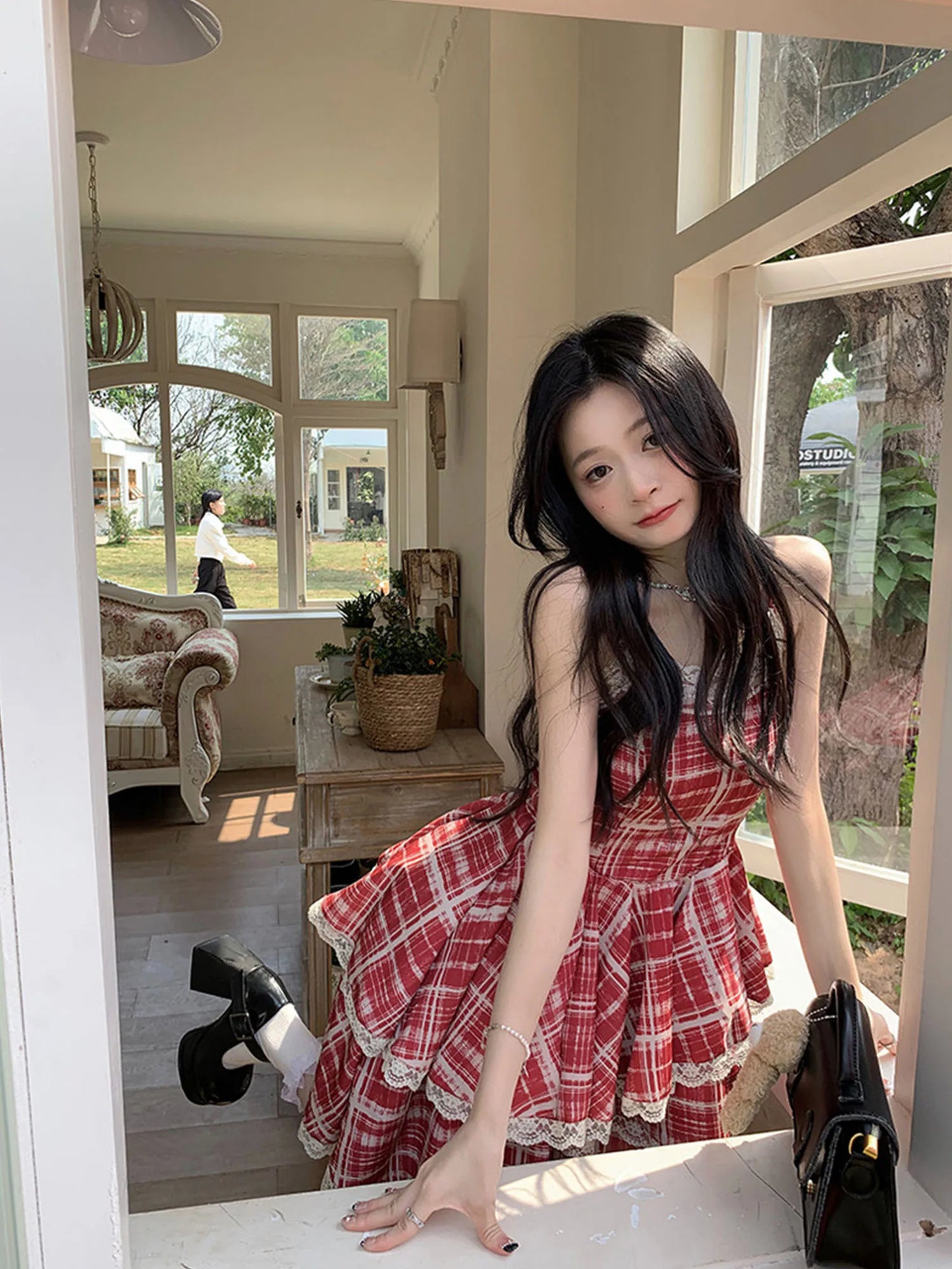Kawaii Countryside Style Lace Ruffles Princess Dresses Women Sweet Lolita Plaid Harajuku Fashion Evening Party Mini Dress Summer
