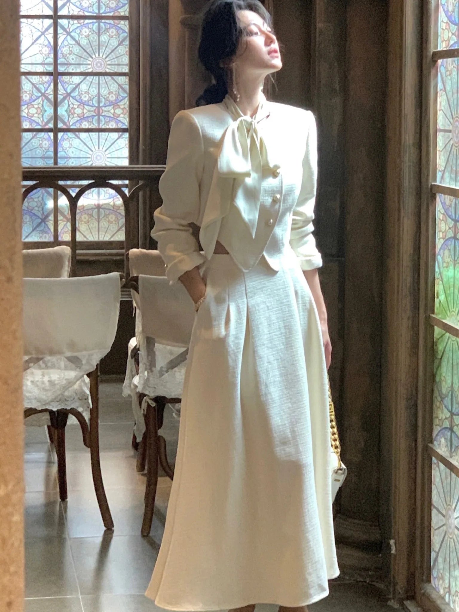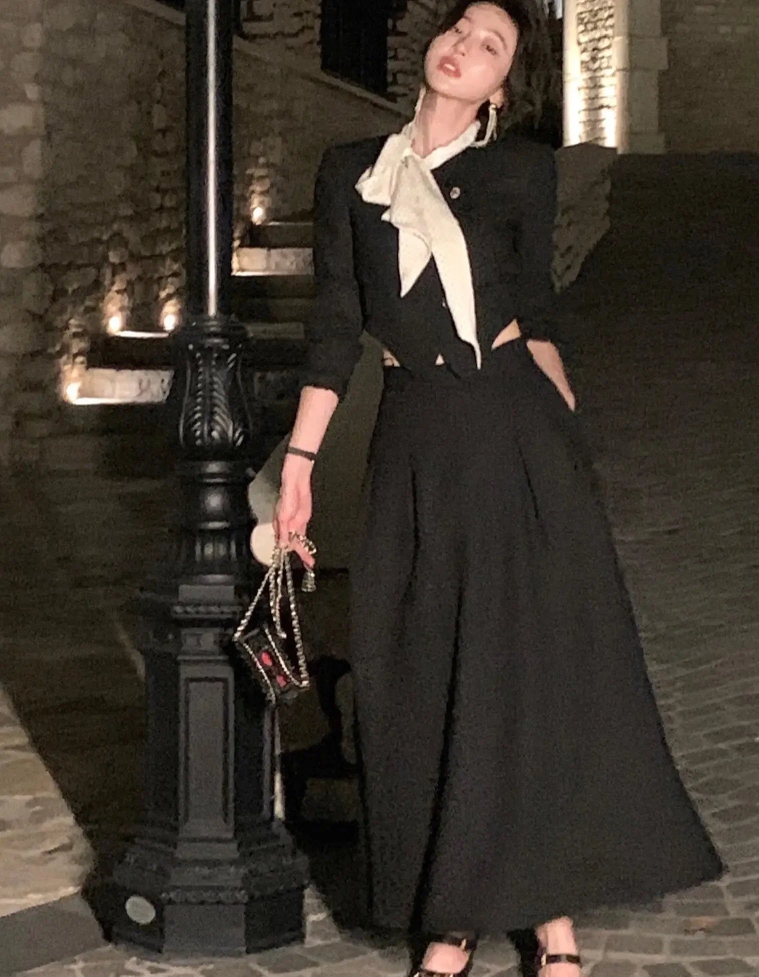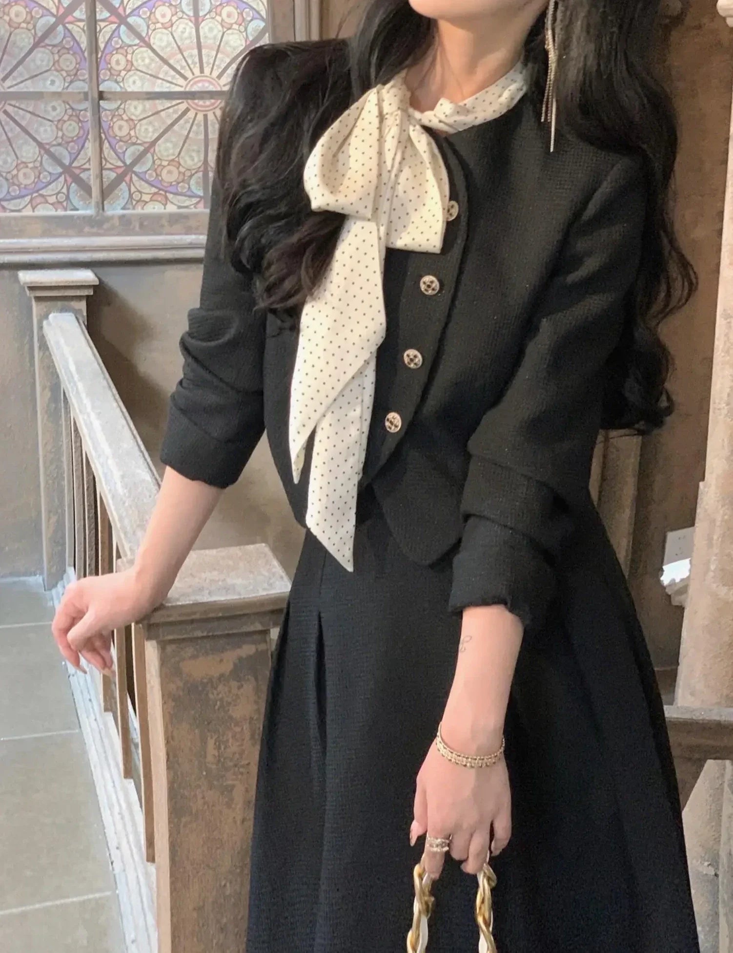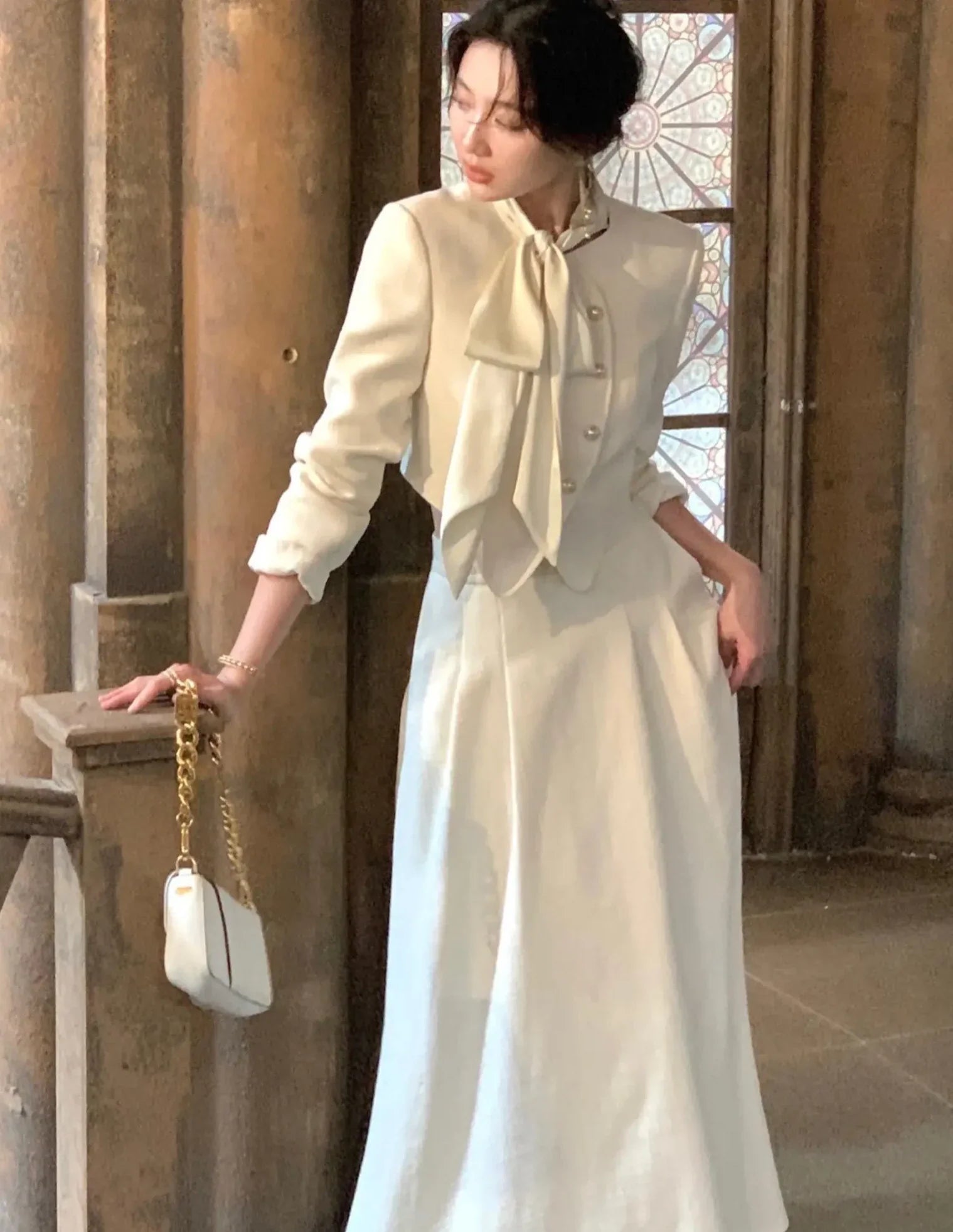 Korean Elegant Blazer 2 Piece Sets for Women Button Jacket with Tie High Waist Skirts Suit Spring Autumn Fashion Party Outfits