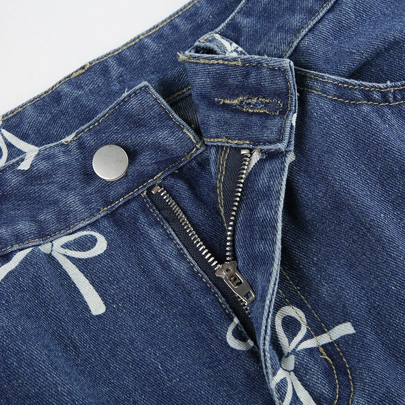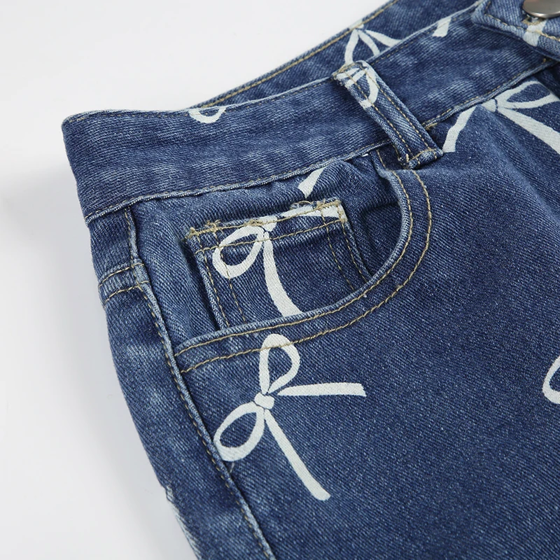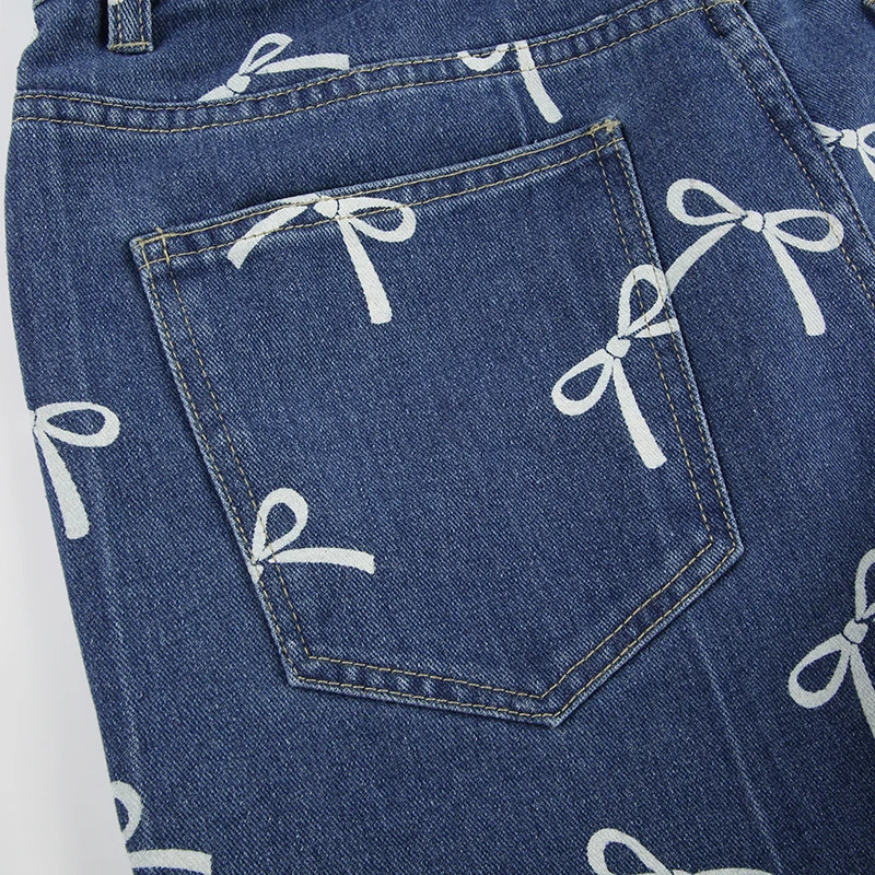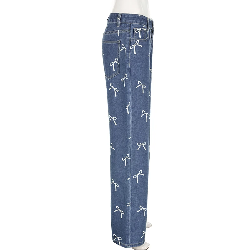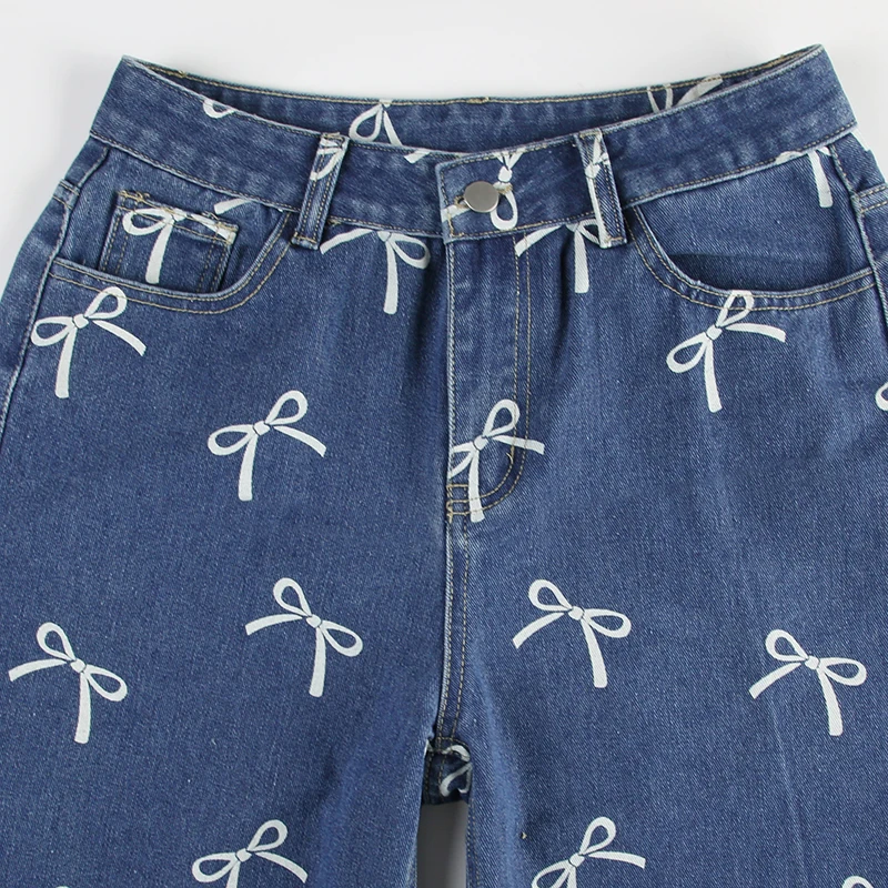 Korean Fashion Bow Pattern Printed Women Jeans Low Waisted Straight Leg Denim Trousers Cute Sweet Harajuku Sweatpants