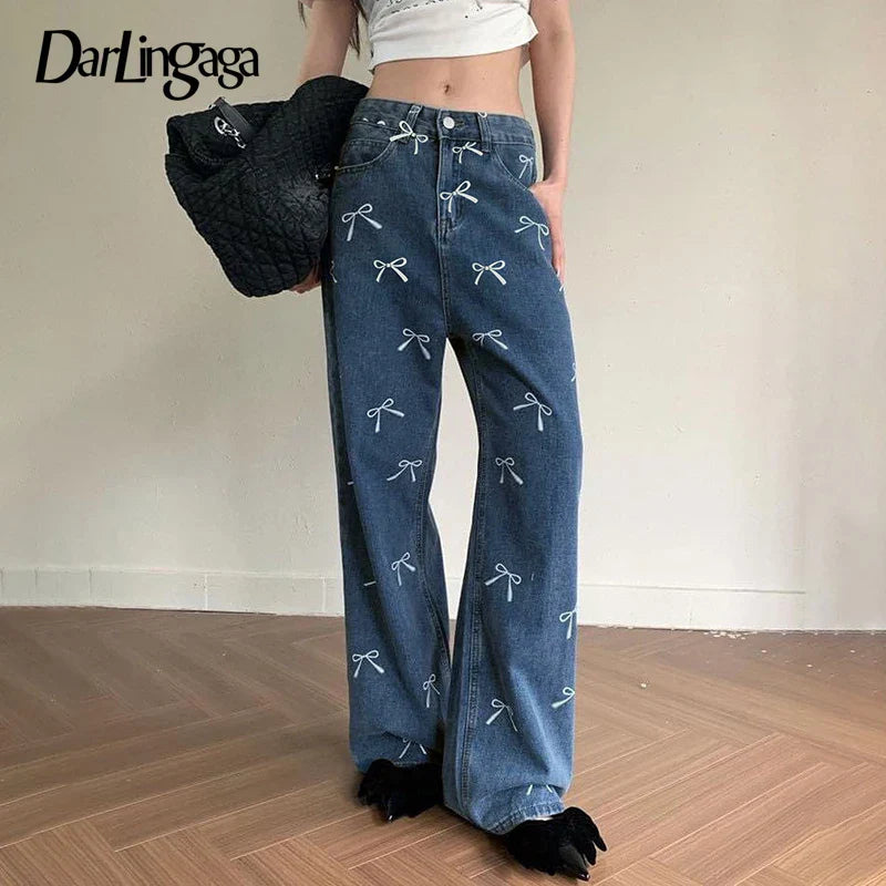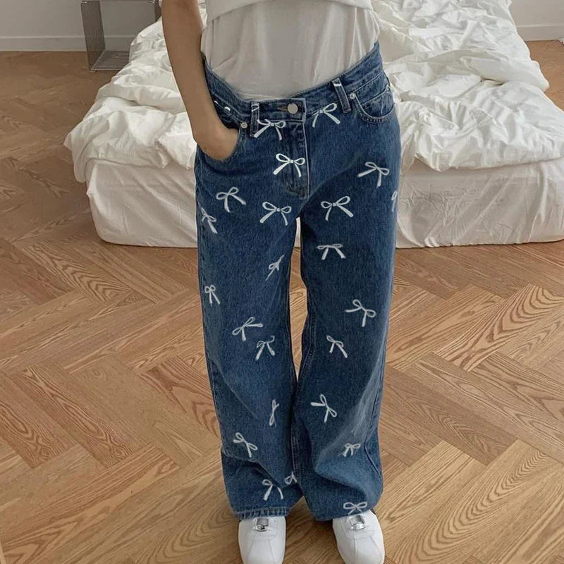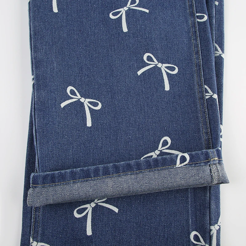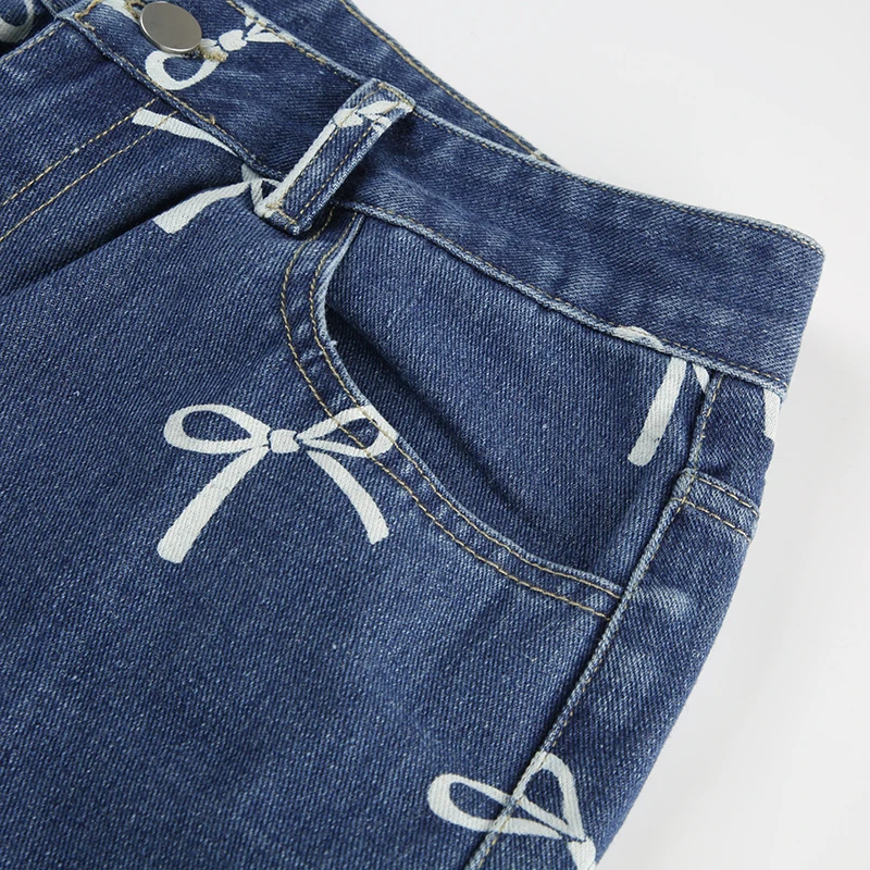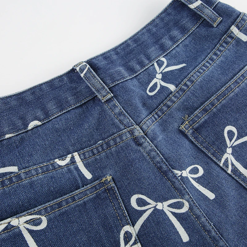 Korean Fashion Bow Pattern Printed Women Jeans Low Waisted Straight Leg Denim Trousers Cute Sweet Harajuku Sweatpants