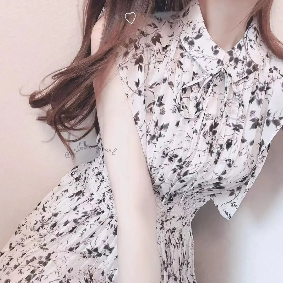 maoxiangshop Japan Style Flying Sleeve Floral Vestidos De Mujer Sweet Pleated Slim Waist Women Dress 2024 Chiffon New Neck Robe
