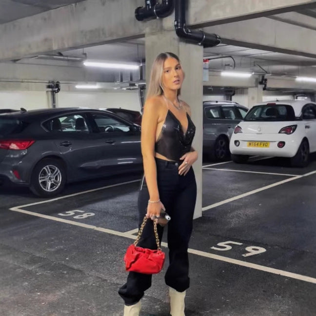 L4821Y sequined bright diamond vest 2025 nightclub style sexy metal chain hanging neck V-neck halter top small vest