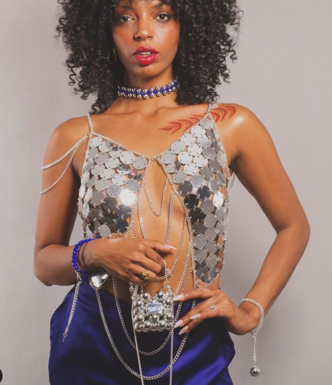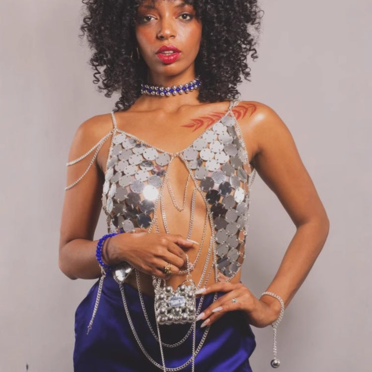 L4839Y 2025 New new acrylic sequin sheet splicing neck top multi-layer fringed chain body chain