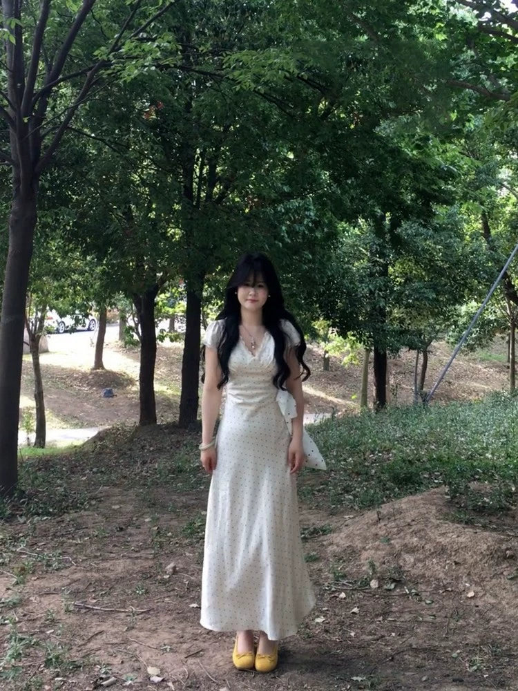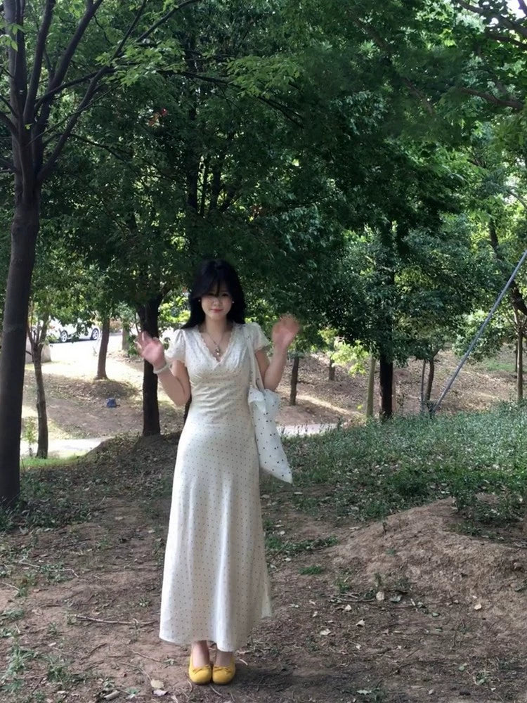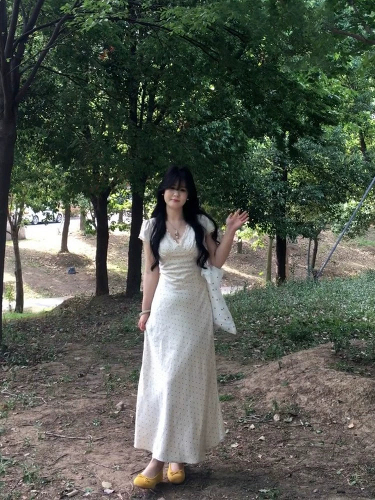 lace edge v-neck apricot polka dot dress summer new temperament slim purple satin dress