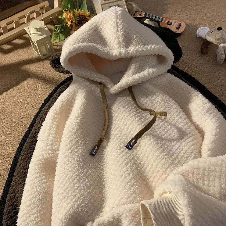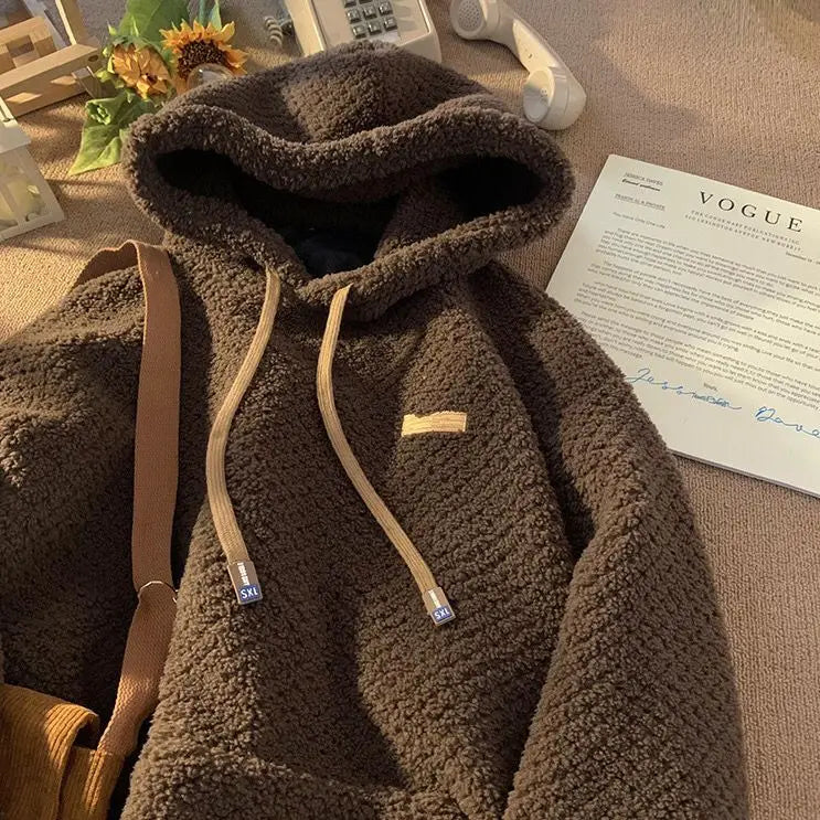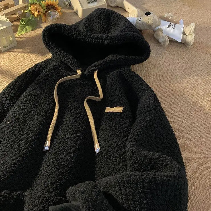 Lamb hair hooded sweater for men and women in winter trend street loose fitting couple hip-hop casual long sleeved top harajuku