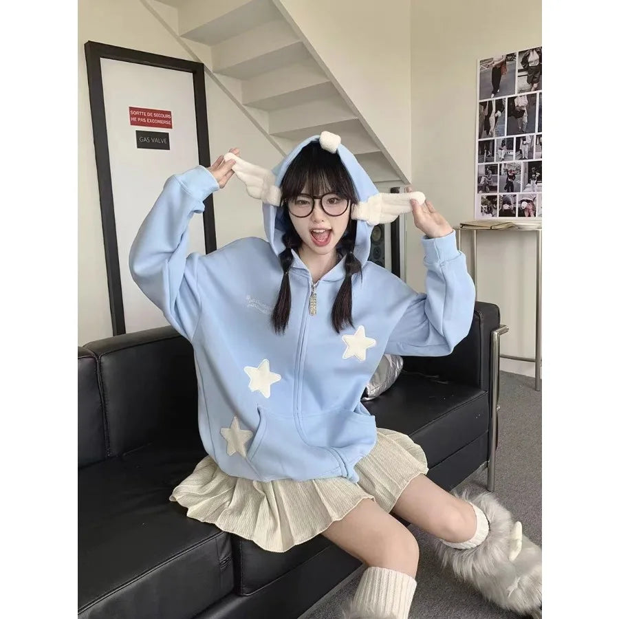 maoxiangshop Lazy and Cute Star Wing Hoodie for Women in Autumn and Winter American Retro Niche Couple Versatile Loose Hooded Oversized Top
