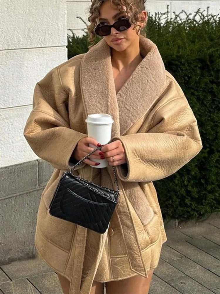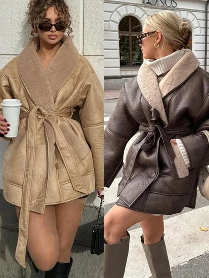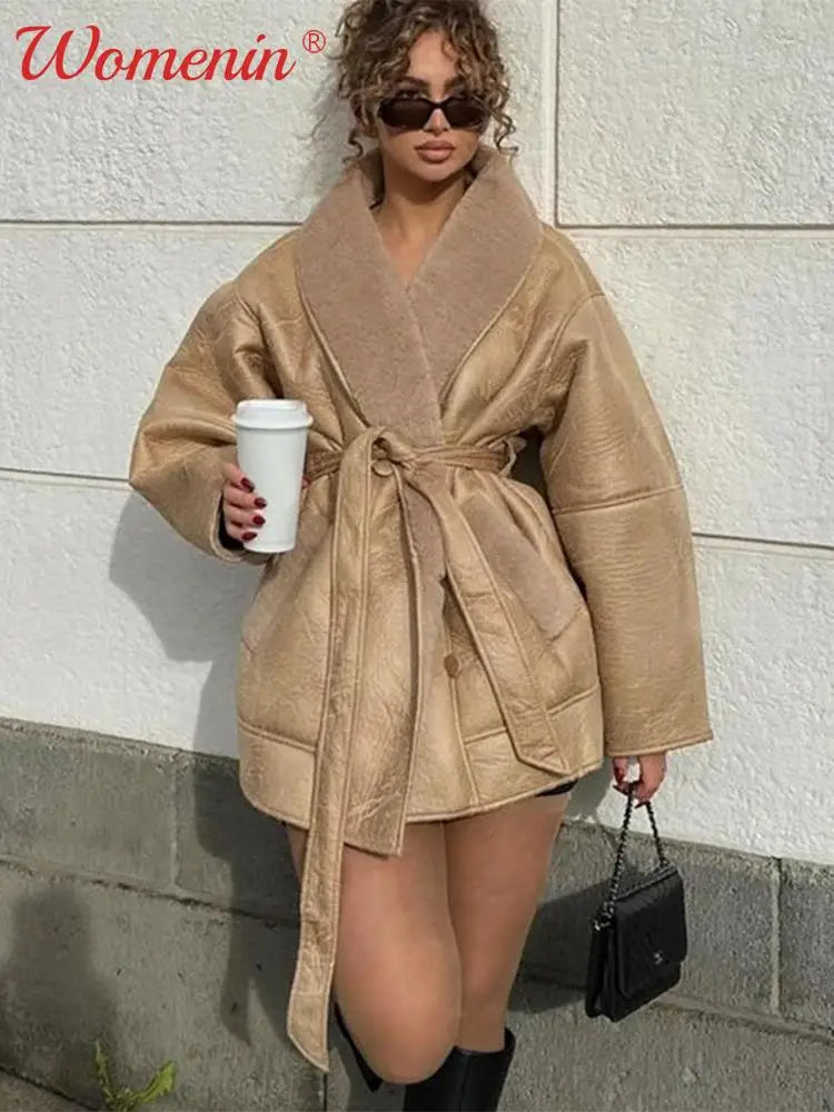 Loose Winter Leather Jacket Women 2023 New Female Vintage Lapel Faux Wool Belt Coat Thicken Warm Oversize Highstreet Outwear Top