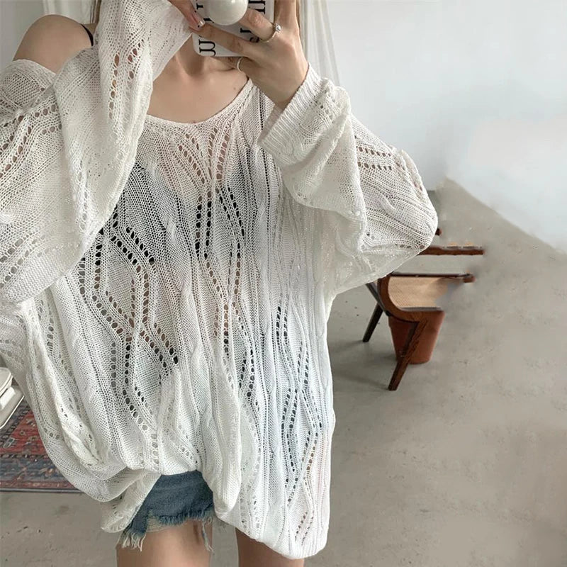 Lucyever Knitted Hollow Out Sweater Women Harajuku Loose Backless Lace Up Y2K Jumpers Female Korean Prepply Thin Sweaters Tops