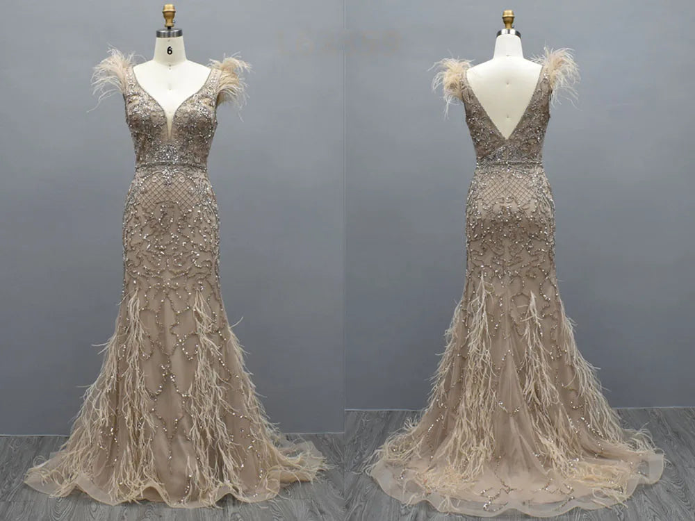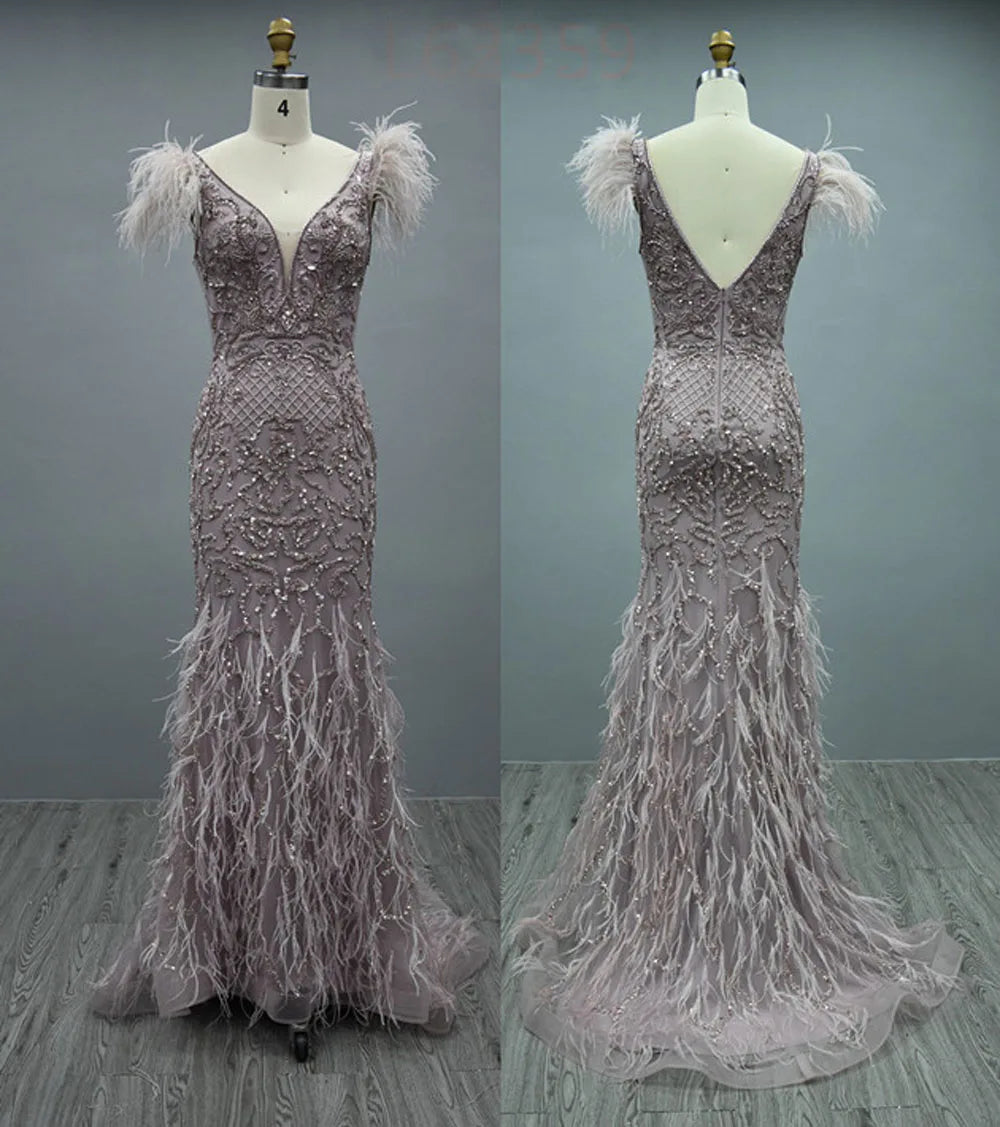 maoxiangshop Luxury Dubai Arabic Women Sequined Midi Evening Dress Prom Gowns Feathers Elegant Beading Wedding Formal Party Vestidos